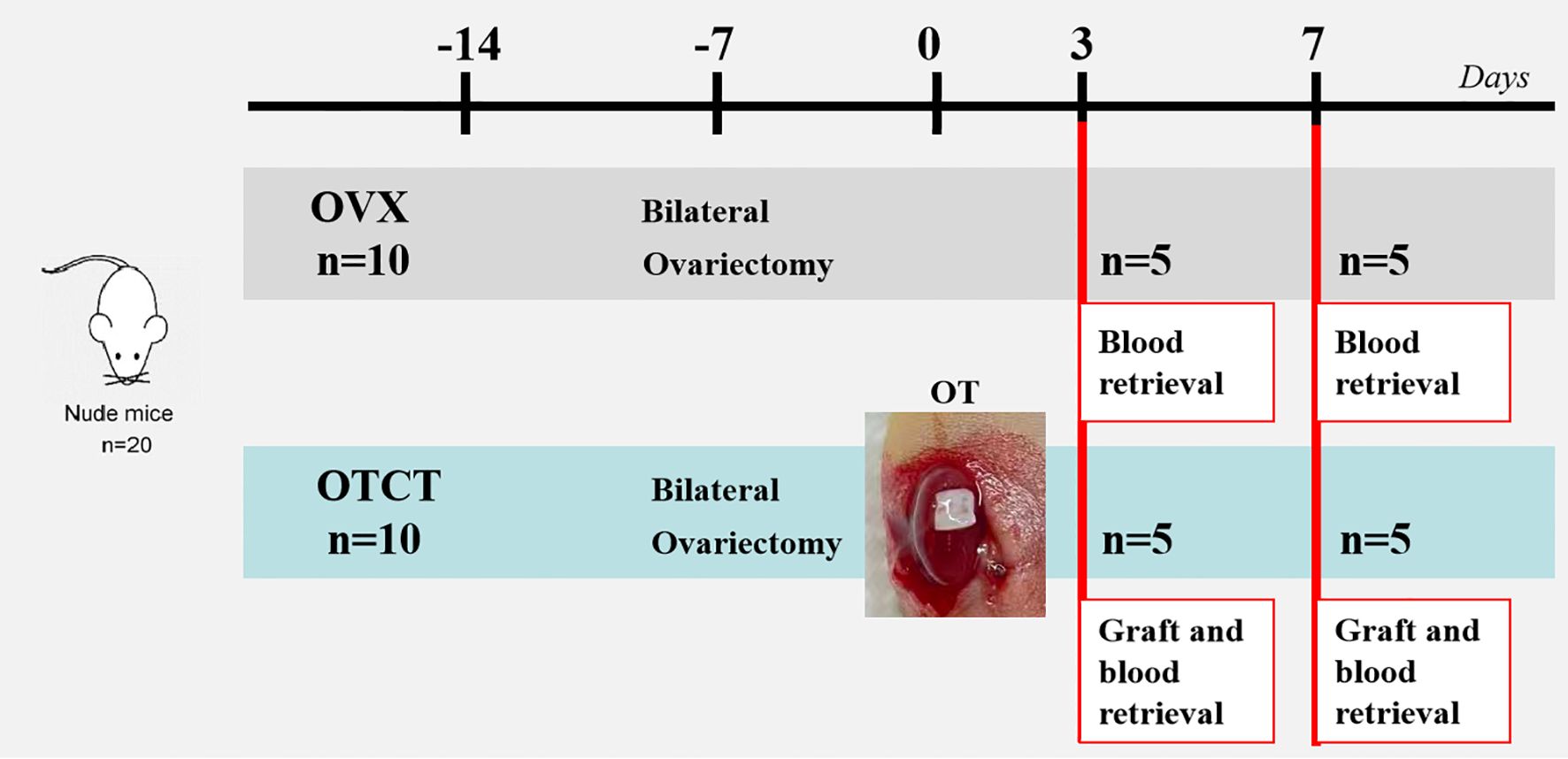 Figure 1. Experimental design. Ovarian tissue from 5 patients was transplanted to the renal capsule of 10 mice. Another 10 mice underwent bilateral ovariectomy without subsequent transplantation to serve as controls. Mice were euthanized on days 3 and 7, and samples were collected for histological and hormone analyses. OVX, bilateral ovariectomy; OT, ovarian transplantation; OTCT, ovarian tissue cryopreservation and transplantation.
