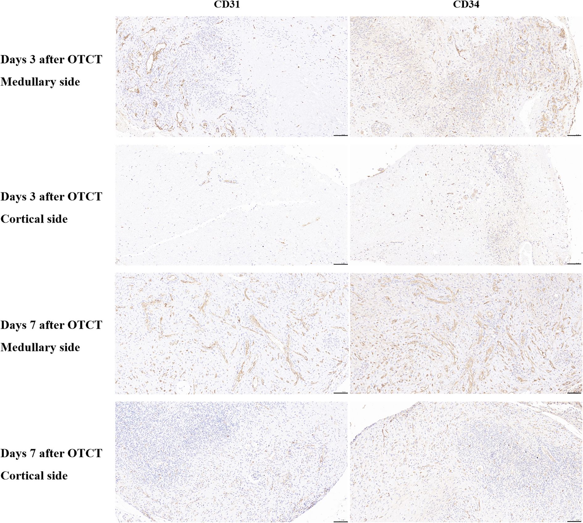 Table 1. The no of CD31 (+), CD34 (+) vessels/mm2, percentage of Ki67 (+) cells, and percentage of TUNEL (+) cells in the medullary and cortical sides at 3 days and 7 days after OTCT.