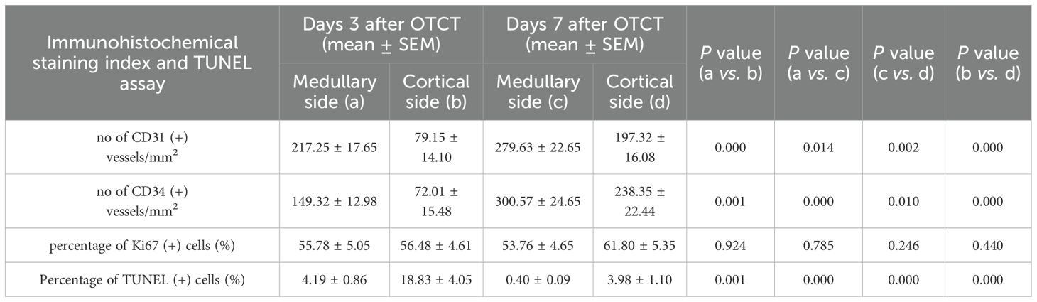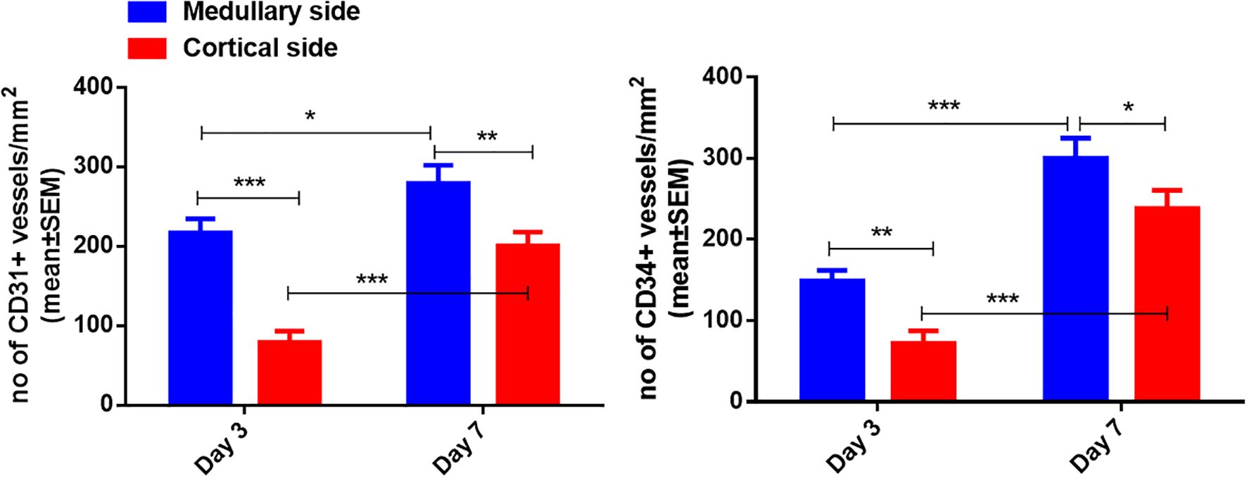 Furthermore, both vascular markers demonstrated significant temporal progression (P < 0.05 for all comparisons): Medullary interface showed increased CD31+ (+28.7%; P = 0.014) and CD34+ (+101.3%; P < 0.001) density from day 3 to 7. Cortical interface exhibited greater relative gains: CD31+ (+149.3%) and CD34+ (+231.0%) densities increased significantly over time (All P < 0.001).