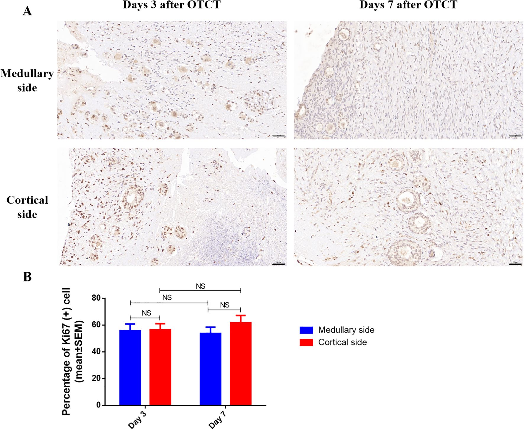Figure 4. (A) Ki67 immunostaining in the medullary and cortical sides of human ovarian xenograft after 3 and 7 days of xenotransplantation. (B) Quantification of the percentage of Ki67-positive cells in the medullary and cortical sides of human ovarian xenograft. Scale bar: 50μm. NS, No significant; OTCT, ovarian tissue cryopreservation and transplantation.