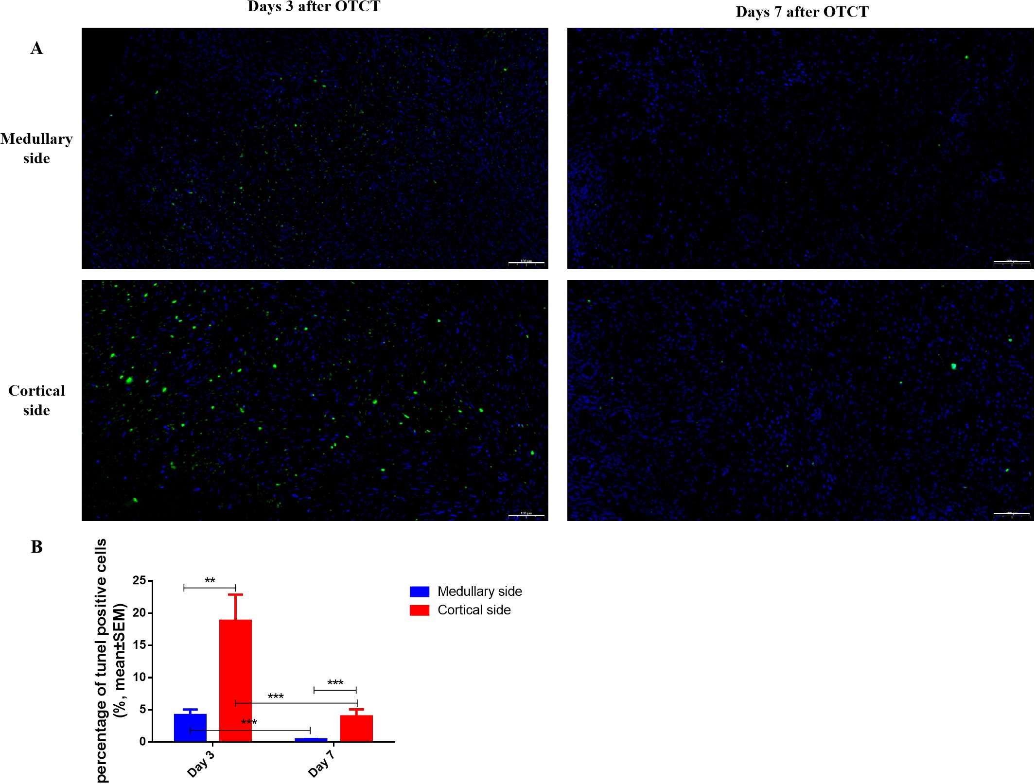 Figure 5. (A) TUNEL immunostaining in the medullary and cortical sides of human ovarian xenograft after 3 and 7 days of xenotransplantation. (B) Quantification of the percentage of TUNEL-positive cells in the medullary and cortical sides of human ovarian xenograft. Scale bar: 100μm. **P < 0.01, ***P < 0.001.
