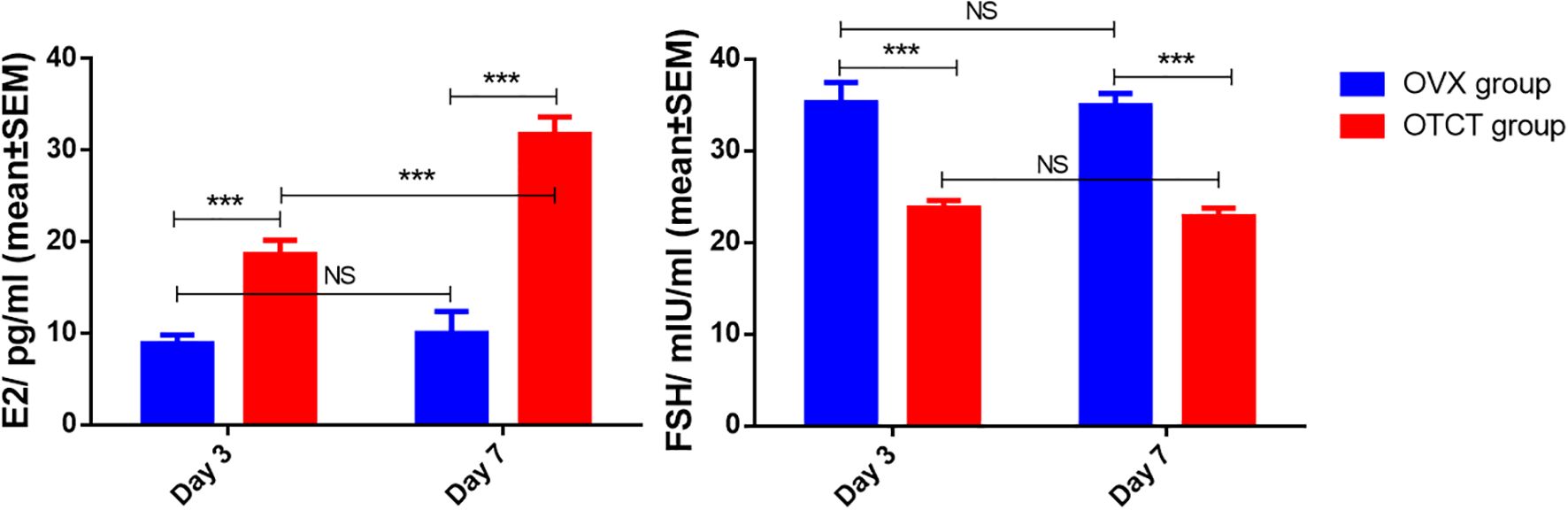 Figure 6. E2 and FSH concentration in mice’s plasma. ***P < 0.001. OVX, bilateral ovariectomy; OTCT, ovarian tissue cryopreservation and transplantation; E2, estradiol; FSH, follicle-stimulating hormone; NS, No significant.