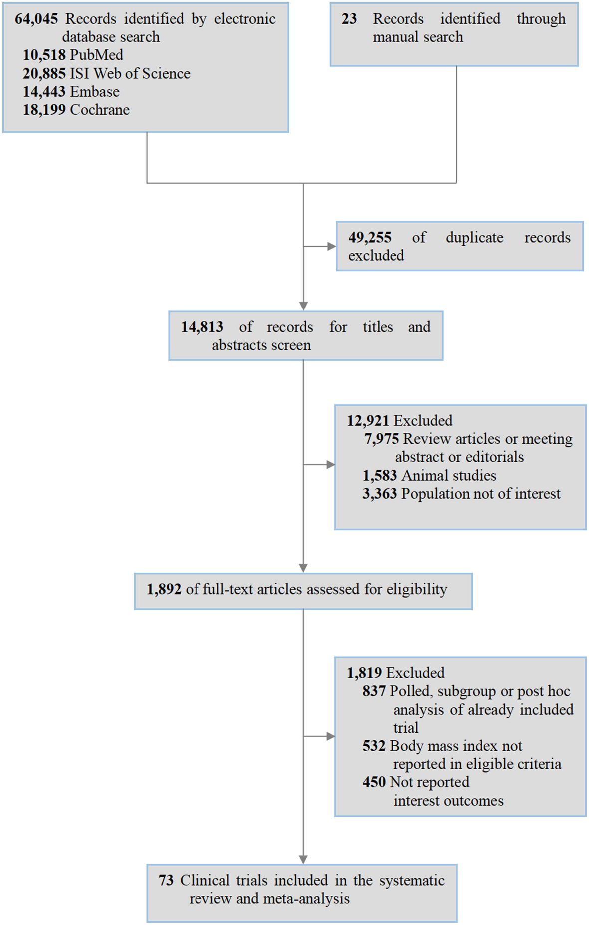 Relevant studies were selected following the PRISMA 2020 guidelines. A total of 64,045 records were identified from the electronic databases (10,518 from PubMed; 20,885 from ISI Web of Science; 14,443 from Embase; 18,199 from Cochrane Library) and 23 via manual search. After excluding 49,255 duplicates, 14,813 records were further screened by reading the titles/abstracts, leading to the exclusion of 12,921 articles (7,975 as reviews/abstracts/editorials; 1,583 as animal studies; 3,363 involving irrelevant populations). Subsequently, the remaining 1,892 full-text articles were analyzed, among which 1,819 were excluded (837 as pooled/subgroup/post-hoc analyses of included trials; 532 without BMI in eligibility criteria; 450 lacking reported outcomes of interest). Finally, 73 clinical trials were included in the systematic review and meta-analysis (Figure 1).