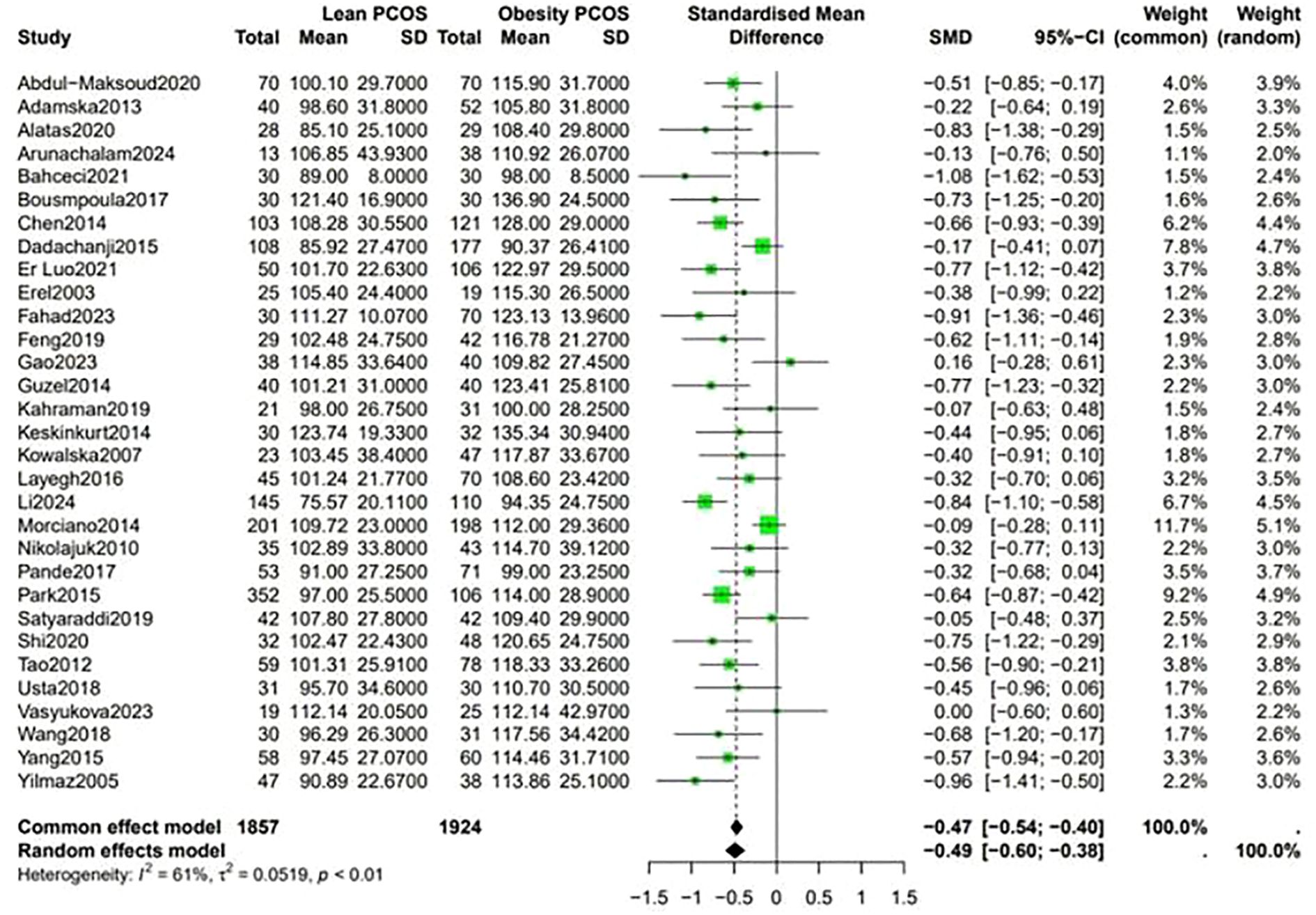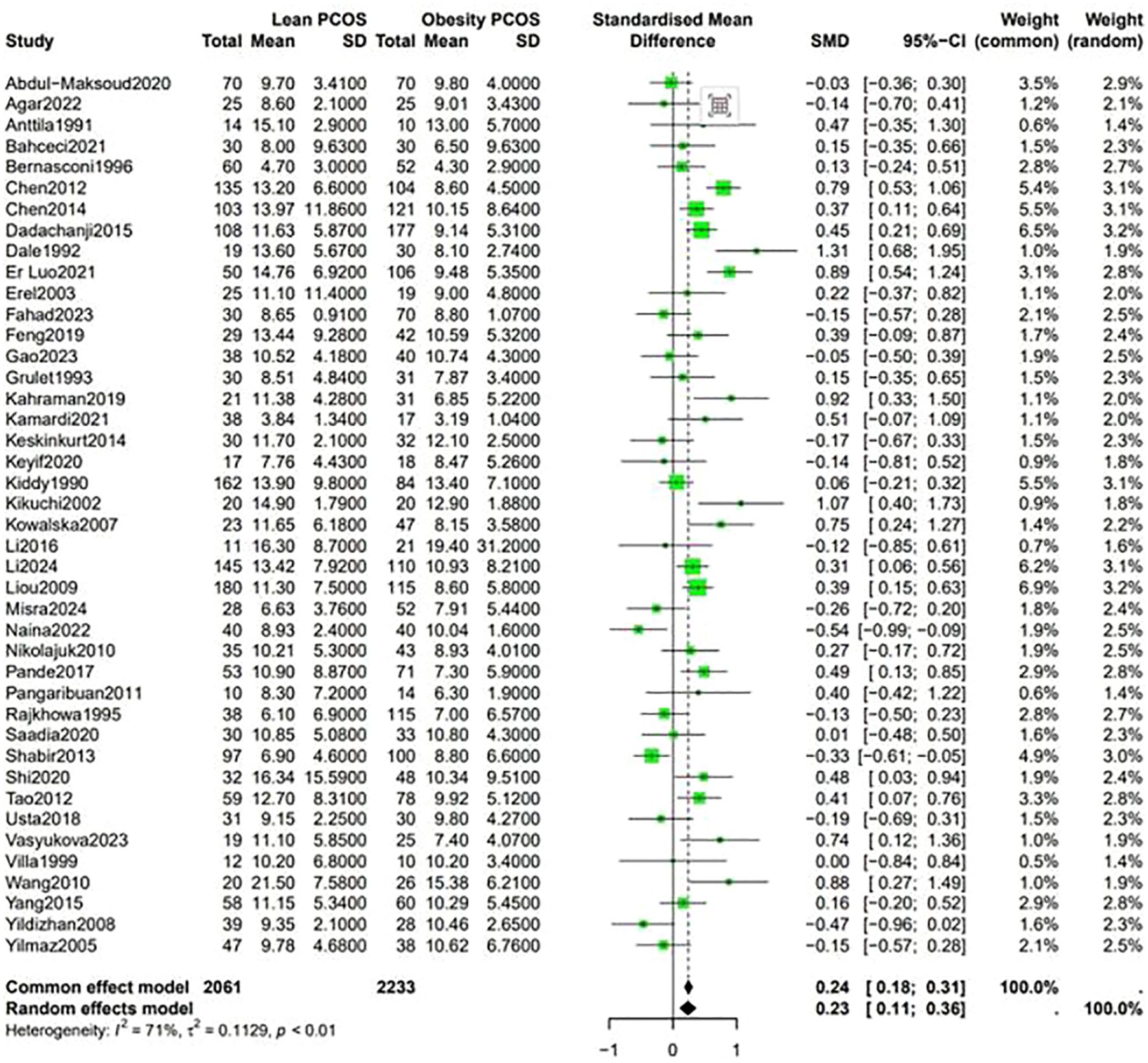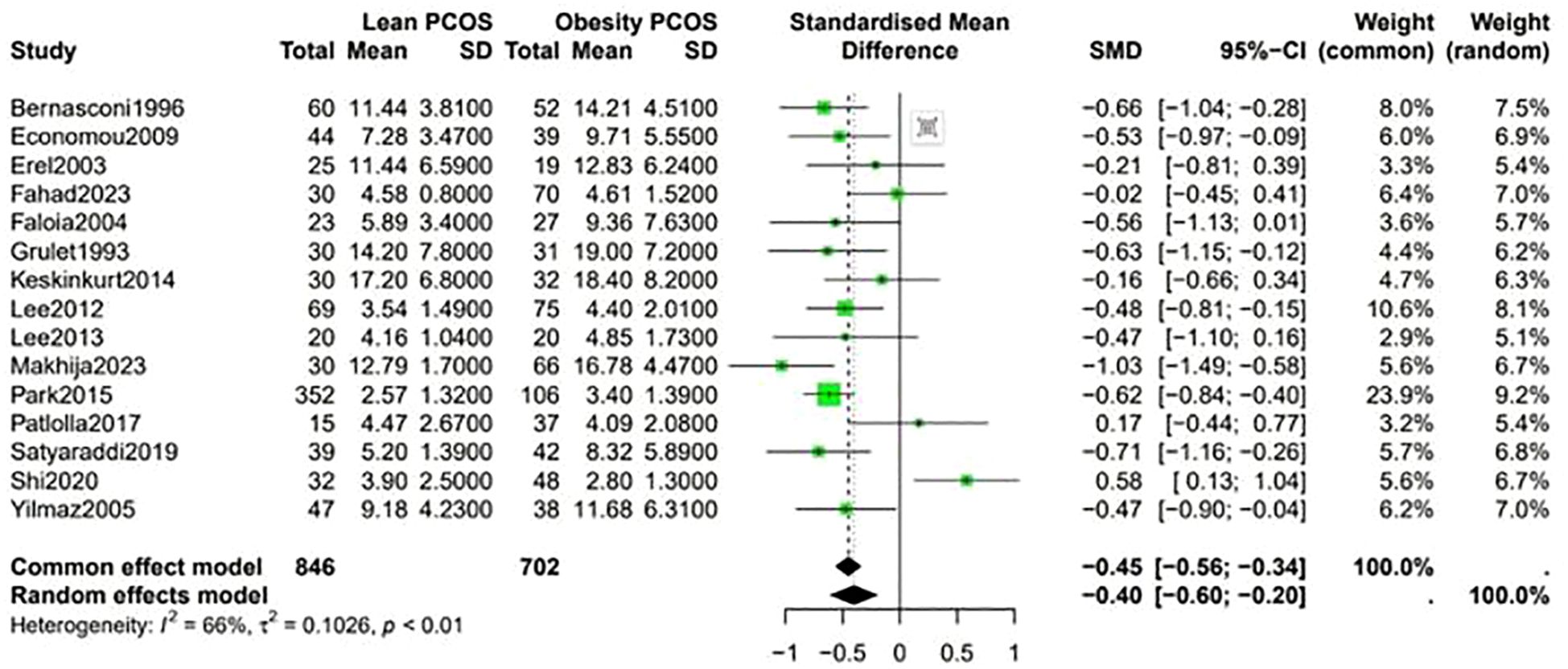 Conclusion: This meta-analysis provides valuable information regarding the profile of metabolic and endocrine characteristics between lean and obese PCOS patients. The specific treatment approach should be customized to each patient’s symptoms, fertility needs, and overall health. Further research is advocated to investigate the underlying mechanisms and to develop more targeted treatment strategies for different subgroups of PCOS patients.