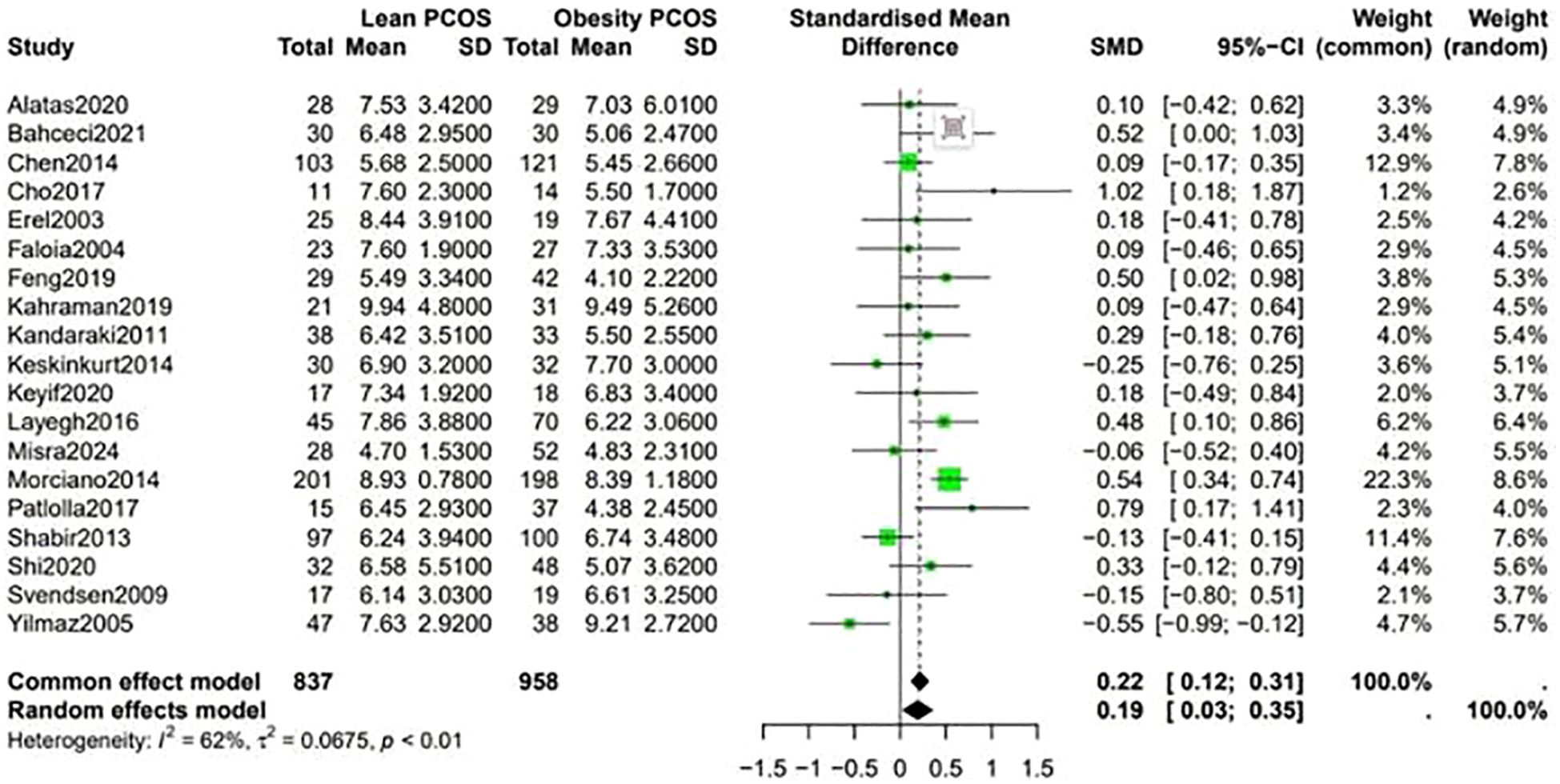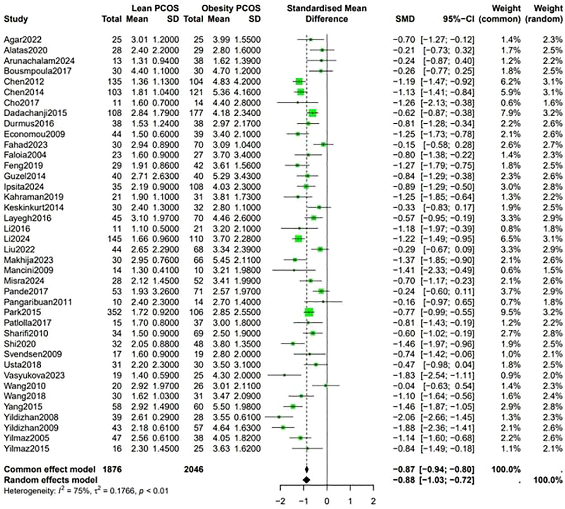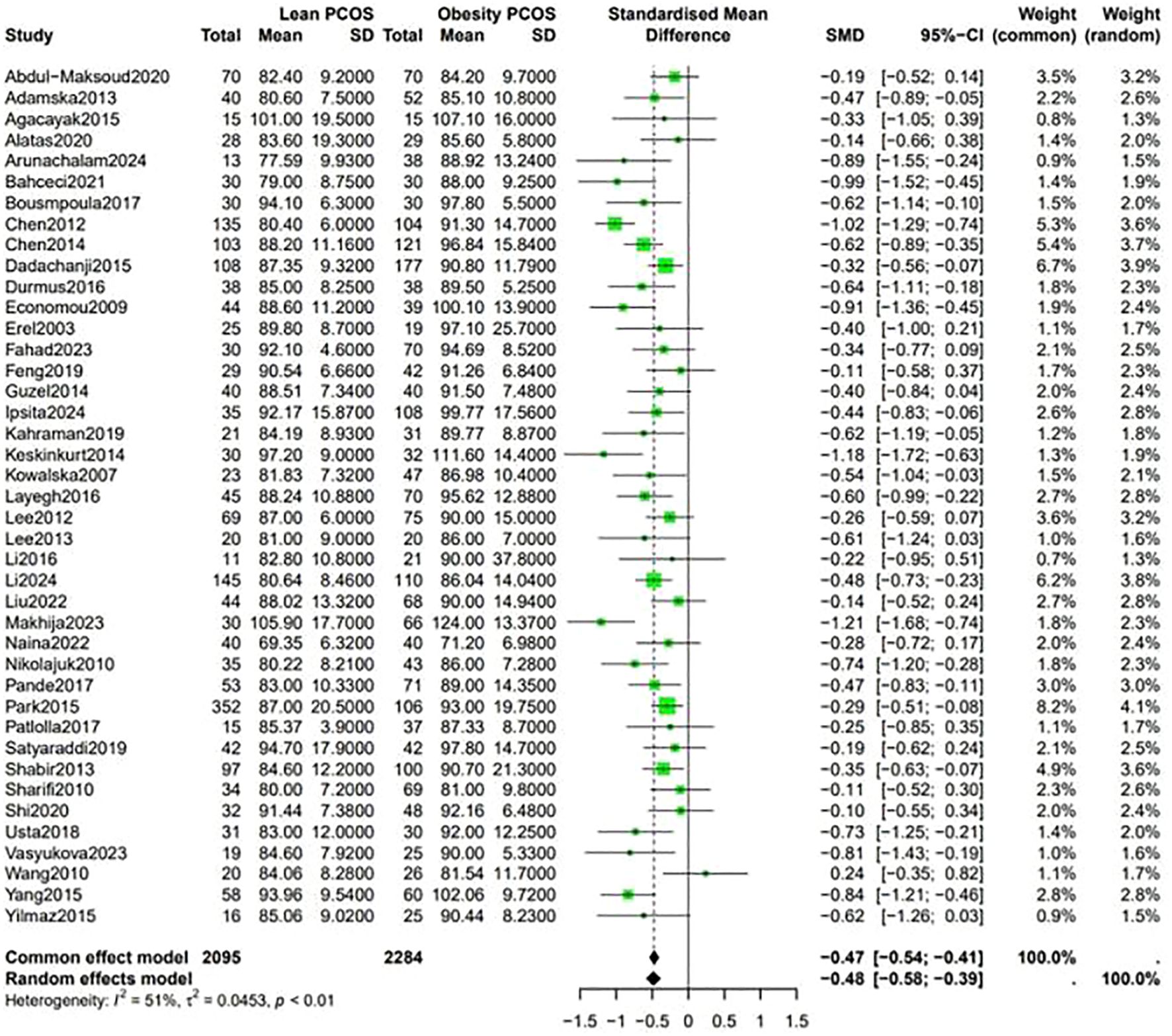 Conclusion: This meta-analysis provides valuable information regarding the profile of metabolic and endocrine characteristics between lean and obese PCOS patients. The specific treatment approach should be customized to each patient’s symptoms, fertility needs, and overall health. Further research is advocated to investigate the underlying mechanisms and to develop more targeted treatment strategies for different subgroups of PCOS patients.