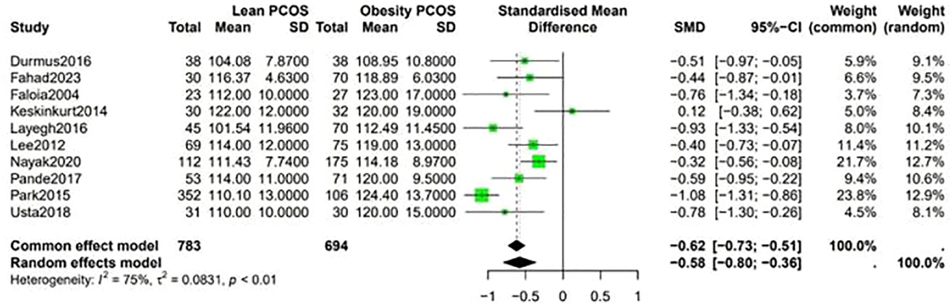 Results: Seventy-three studies were analyzed. There were marked differences in metabolic indicators between the two groups. Lean PCOS participants had slightly lower levels of diastolic (SMD −0.56, 95% CI −0.79 to −0.33, p < 0.01) and systolic (SMD −0.58, 95% CI −0.80 to −0.36, p < 0.0003) BP relative to individuals with obese PCOS. They had lower levels of LDL (SMD −0.49, 95% CI −0.60 to −0.38, p < 0.01) and triglycerides (SMD −0.72, 95% CI −0.85 to −0.59, p < 0.01) than obese PCOS participants. The LH/FSH ratio in lean PCOS patients exceeded that in obese PCOS patients (SMD 0.23, 95% CI 0.07 to 0.40, p < 0.01). Moreover, the homeostasis model assessment of insulin resistance (HOMA-IR) was higher in obese PCOS patients (SMD -0.88, 95% CI -1.03 to -0.72, p < 0.01). However, there were no significant differences in anti-Müllerian hormone (AMH) level between the two groups.