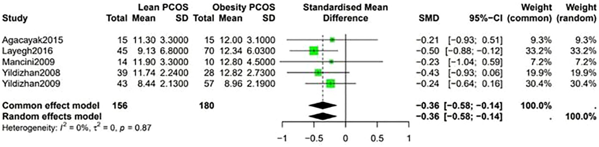 All statistical comparisons between lean PCOS and obese PCOS were performed using the Revman software (Version 5.4.1). Standard mean difference (SMD) and their respective 95% confidence intervals (CIs) were calculated for the two groups and the I2 statistic was employed, with values less than 50% indicating mild heterogeneity. In cases where there was significant heterogeneity, sensitivity analyses were conducted using the leave-one-out method. A p value below 0.05 indicated significant difference between the groups.