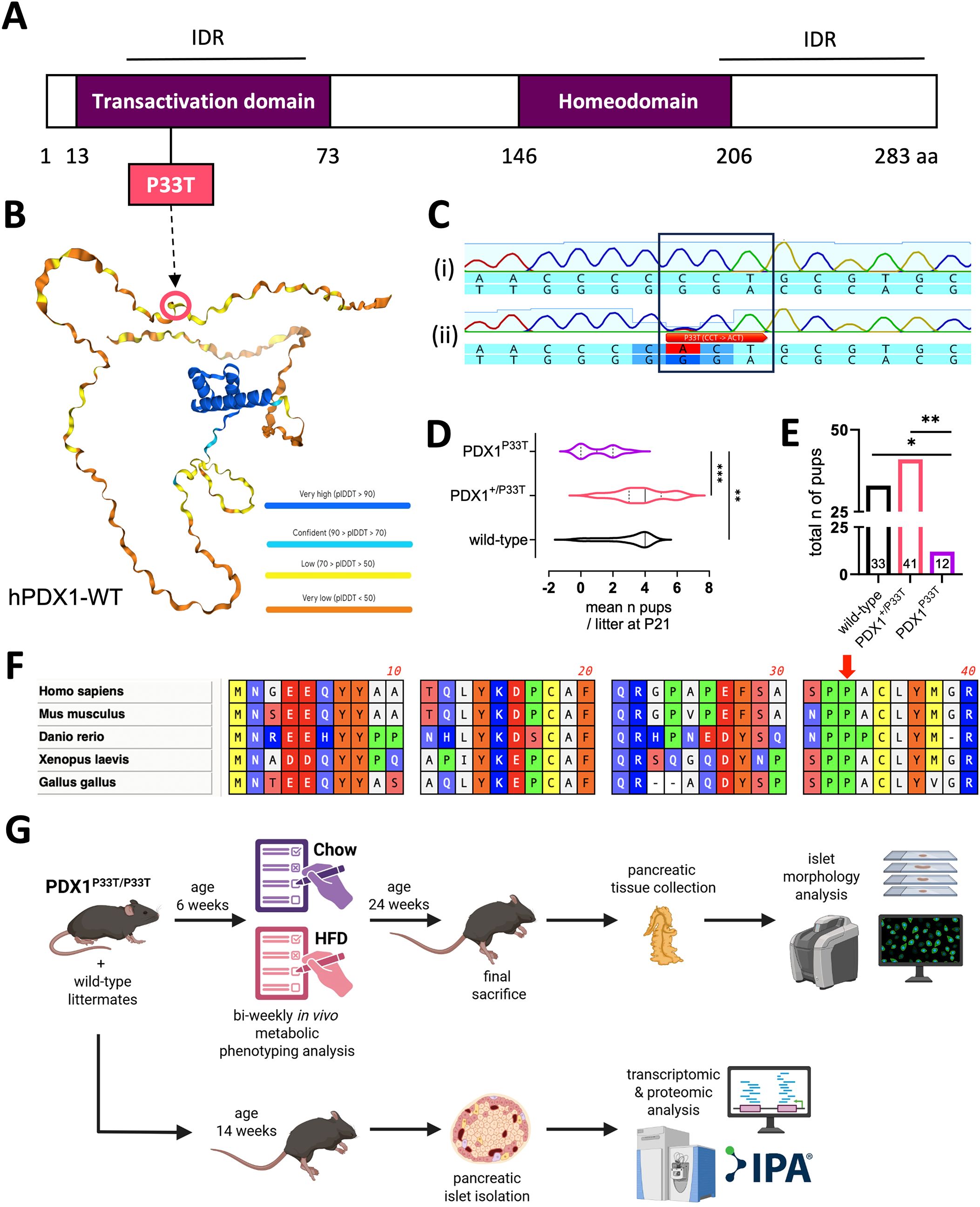 Figure 1. PDX1P33T protein structure does not inhibit viability of homozygous mutant mice. (A) Scheme of human PDX1 protein structure displaying its domains, IDRs and the location of the investigated point mutation P33T. (B) Alpha-fold rendering of the human PDX1 protein structure, colored according to prediction accuracy certainty, including the location of the investigated point mutation P33T. (C) Sequences of the targeted genomic region in the wild-type (i) and founder animal (ii) showing a single nucleotide substitution (C > A) at position c.97. Wild-type sequence: 5’-…CCCCCTGCG…-3’. Mutated sequence: 5’-…CCCACTGCG…-3’. (D) Graph displaying the mean number of offspring per genotype per litter, at postnatal stage P21, acquired by heterozygous mating (n = 11 litters). (E) Graph displaying the total number of pups at postnatal stage P21 acquired from all 11 litters from heterozygous matings, according to their genotypes. Genotype counts deviated significantly from the expected Mendelian 1:2:1 ratio (χ2 = 10.44, df = 2, p = 0.0054). When analysis was restricted to surviving offspring (WT vs. Het only), the observed distribution differed from an 1:2 expectation (χ2 = 4.22, df = 2, p = 0.04), indicating marked underrepresentation of homozygous and a smaller but detectable reduction in heterozygote survival. (F) Multiple sequence alignment of the first 40 amino acids of the PDX1 protein from five different species including homo sapiens (human), mus musculus (mouse), danio rerio (zebrafish), xenopus laevis (frog) and gallus gallus (chicken), particularly depicting the conservation of the P33 residue among multiple species. (G) Graphical summary of the experimental pipeline described in this manuscript, HFD – high fat diet, IPA – Ingenuity Pathway Analysis. Created in BioRender (72). "*" p-value ≤ 0.05; "**" p-value ≤ 0.005; "***" p-value ≤ 0.0005.