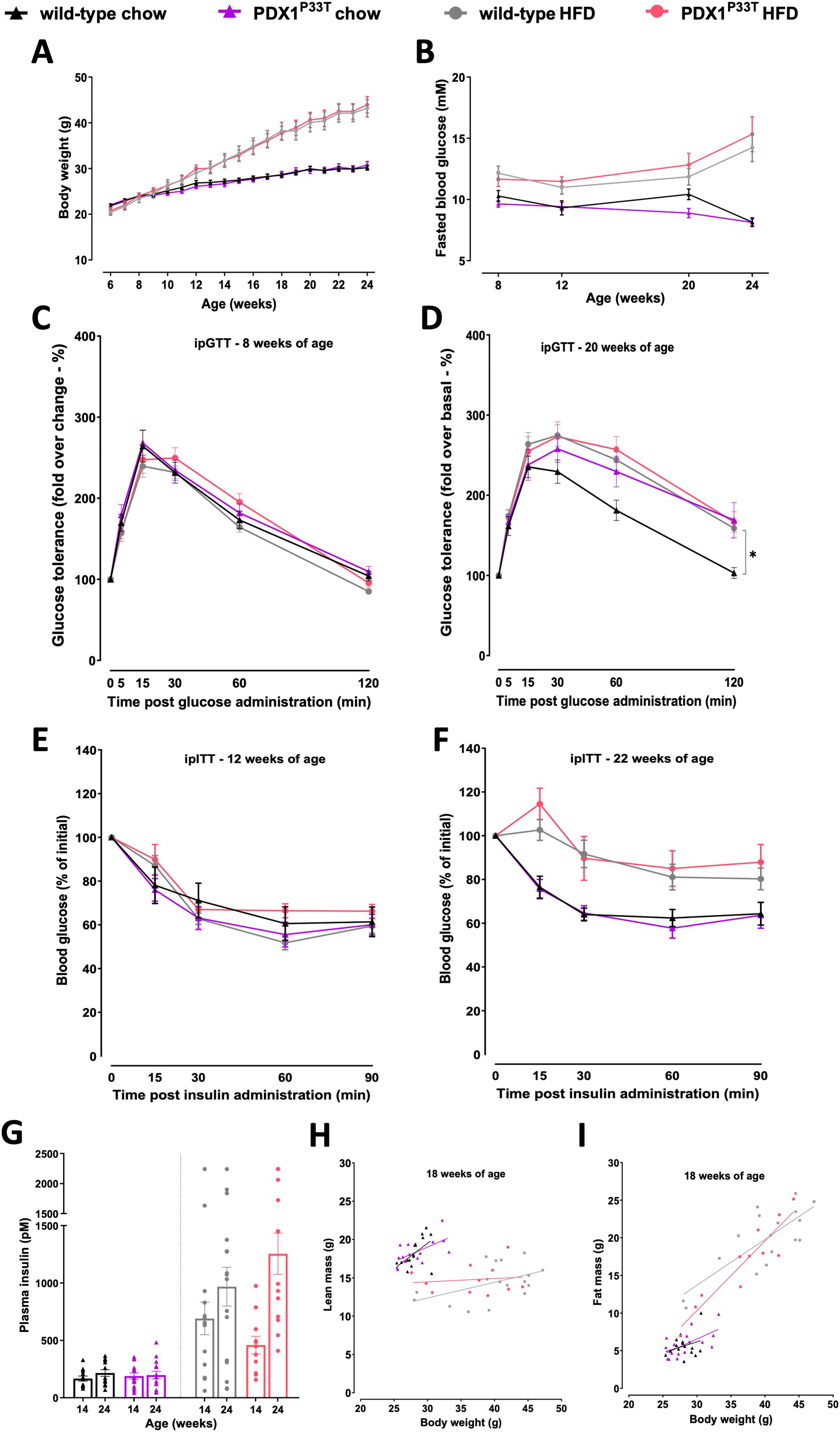 Figure 2. Male PDX1P33T mice maintain normoglycemia and insulin sensitivity in adulthood. Comparison between male wild-type and mutant PDX1P33T mice on either a chow diet or HFD diet. (A) Weekly ad libitum body weight in wild-type and homozygous PDX1P33T mice, data are shown as mean SEM, n=12-15. (B) Blood glucose levels post 6h fasting in wild-type and homozygous PDX1P33T mice, data are shown as mean SEM, n=12-15; (C) I.p. glucose tolerance test at 8 weeks of age and (D) 20 weeks of age after a 6h fasting period; administered D-glucose (2g/kg); blood glucose values were normalized to baseline (t = 0 min), n=12-15. (E) I.p. insulin tolerance test at 12 weeks of age and (F) 22 weeks of age after a 6h fasting period; injected with human recombinant insulin (0,75 U/kg); blood glucose values were normalized to baseline (t = 0 min), n=12-15. (G) Plasma insulin levels measured in blood samples collected from the retroorbital plexus after a 6h fasting period at 14 and 24 weeks of age from wild-type and PDX1P33T mutant mice, n=12-15. (H–I) Body composition analysis showing the linear regression of lean mass (H) and fat mass (I) against total body weight, n=12-15. "*" p-value ≤ 0.05.