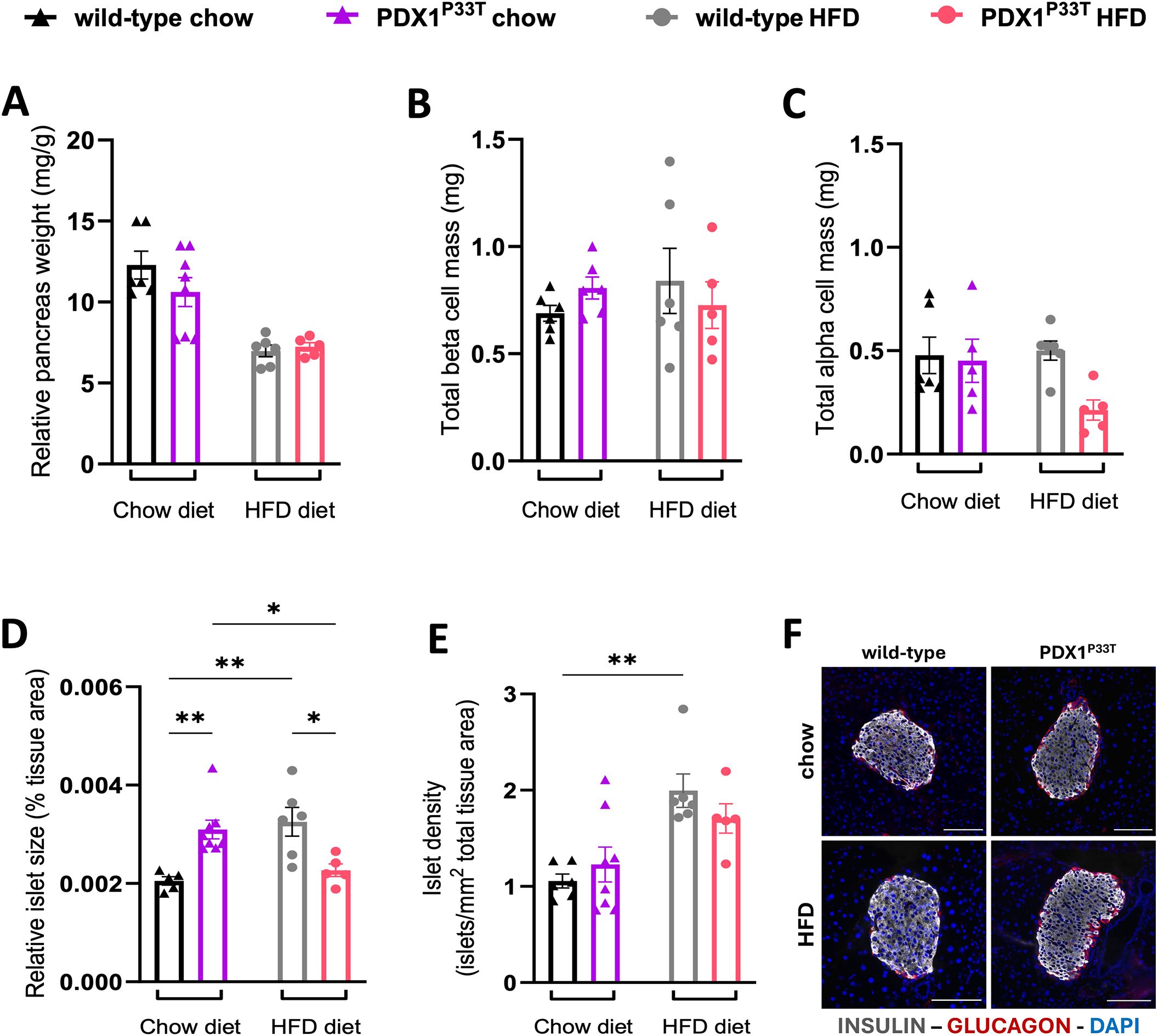 Methods: Using CRISPR-Cas9 technology, we generated the first mouse model carrying one of the most prevalent pathological PDX1 point mutation found in human patients, P33T, and conducted an 18-week in vivo phenotyping experiment assessing homozygous PDX1P33T and wild-type littermates on both chow and high fat diet (HFD). Additionally, transcriptomic and proteomic analyses were performed on isolated pancreatic islets. Islet architecture was investigated via fluorescent microscopy.