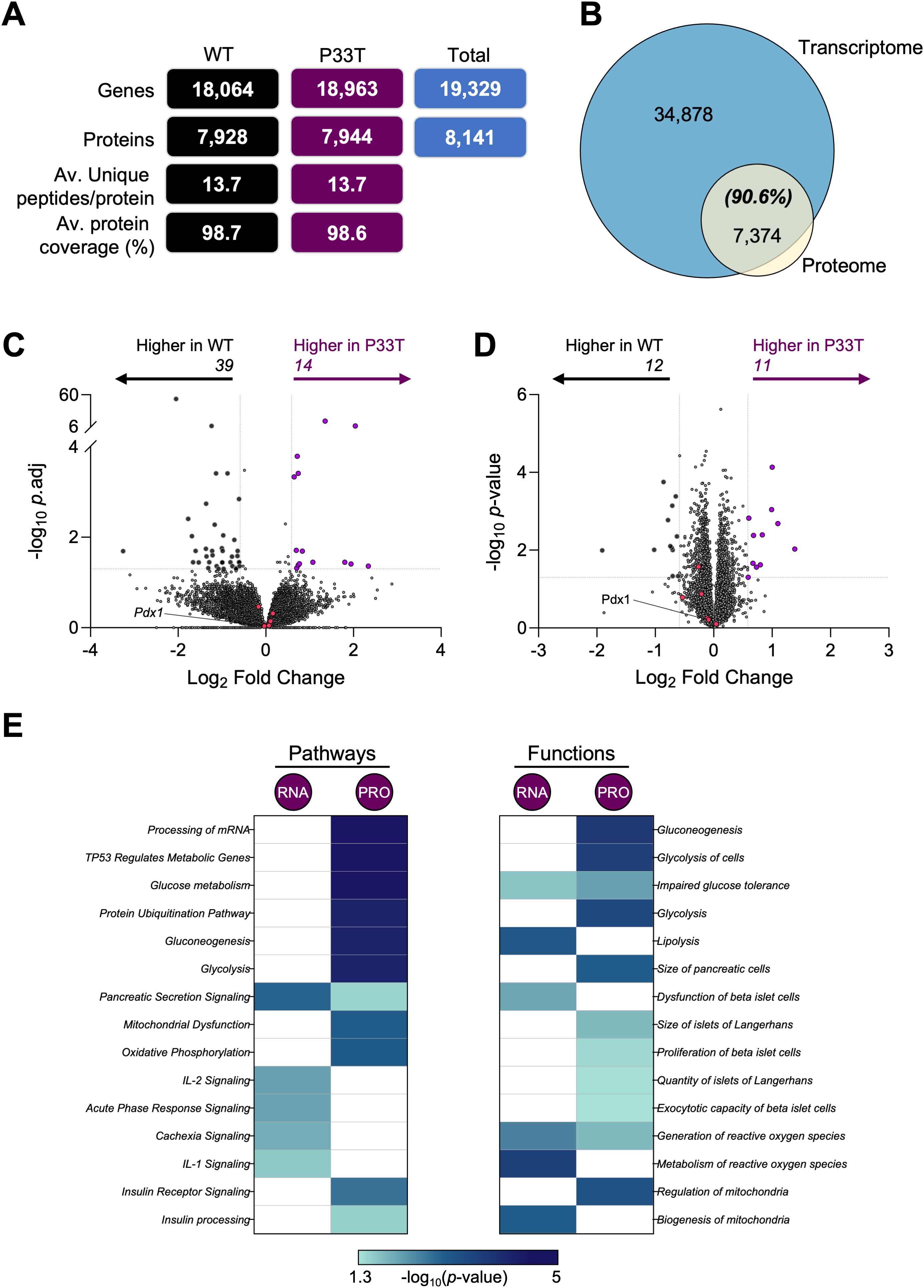 Figure 4. Transcriptomic and proteomic profiles of whole pancreatic islets of PDX1P33T mice show hints at increased cell stress. Transcriptomic and proteomic analyses were performed using isolated islets as described above (n = 5–6 biological replicates collected from 6 individual mice/biological replicate). (A) The total number of genes and proteins identified within each population and total, including the average number of unique peptides per protein and average protein coverage. (B) Overlap between all gene-protein products and those detected in the proteomic analysis. Volcano plots depict the log2 fold change (x-axis) in (C) gene and (D) protein expression; y-axis is the –log10 adj. or p-value respectively. Genes/proteins with significantly different expression (fold change ± 1.5 and p-value ≤ 0.05) are drawn in black (downregulated) and purple (upregulated). Genes/proteins of interest (Pdx1, Kcnj11, Mafa, Slc2a2, Ins1, Ins2) are colored in pink. (E) Heatmaps present the top 15 significantly enriched (p-value ≤ 0.05) pathways and functions identified by Ingenuity Pathway Analysis.