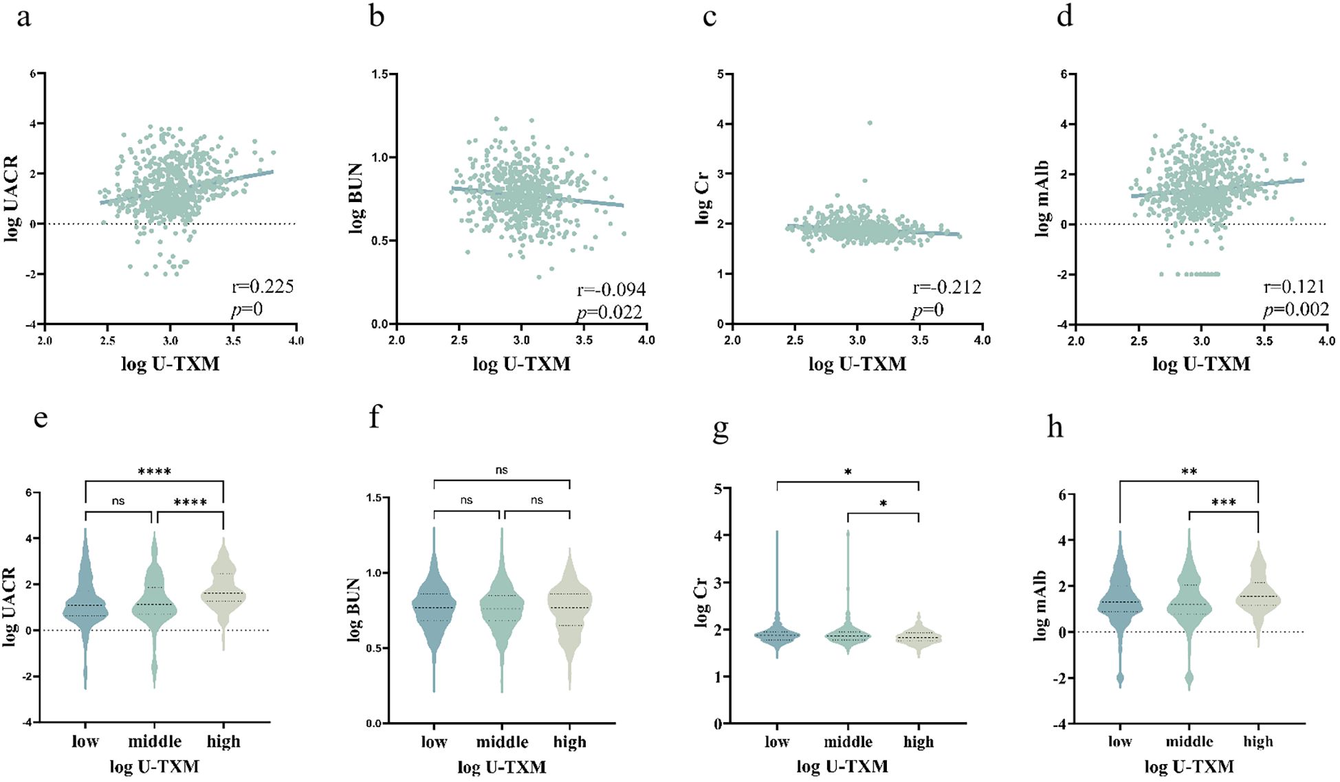 Figure 1. Correlations between U-TXM and renal function markers.(a) Scatter plot of log(U-TXM) vs. log(UACR); (b) scatter plot of log(U-TXM) vs. log(BUN); (c) scatter plot of log(U-TXM) vs. log(serum creatinine, Cr); (d) scatter plot of log(U-TXM) vs. log(microalbumin, mAlb); (e) violin plot of UACR across low/middle/high U-TXM groups; (f) violin plot of BUN across low/middle/high U-TXM groups; (g) violin plot of Cr across low/middle/high U-TXM groups; (h) violin plot of mAlb across low/middle/high U-TXM groups.Panels (a–d) display Spearman correlation coefficients (r) with P values; panels (e–h) show distributions stratified by U-TXM. Variables were log-transformed where applicable. Differences in the plots are indicated by asterisks: ns denotes P>0.05, * denotes P<0.05, ** denotes P<0.01, *** denotes P<0.001, **** denotes P<0.0001.