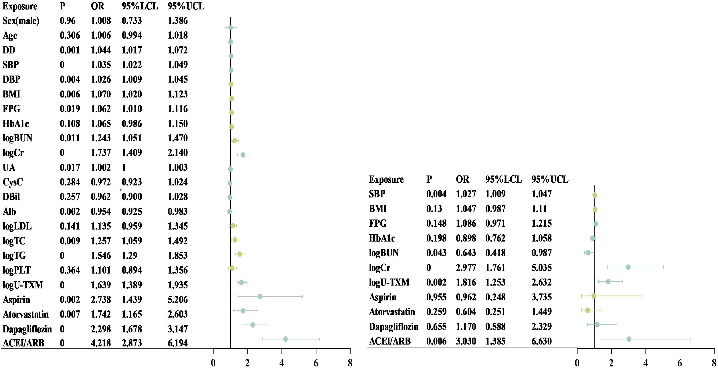 Figure 2. Forest plot of univariate and multivariate logistic regression analysis. This chart shows the effect of different clinical variables on the target outcome in univariate (left) and multifactorial (right) Logistic regression analyses. The dot represents the OR and the horizontal line represents the 95% CI. Chart on the left (single factor analysis): Including Sex, Age, DD, SBP, DBP, BMI, FPG, HbA1c, logBUN, logCr, UA, CysC, FPG, DBil, Alb, logLDL, logTC, logTG, logPLT, and LOU-TXM. Among them, the variables with a P-value <0.05 were statistically significant. Figure on the right (multivariate analysis): After adjusting for other variables, SBP, logBUN, logCr, and logU-TXM were still significantly associated with the target outcome (P<0.05), while the effects of BMI, FPG, and HbA1c were no longer significant after adjustment. Alb, albumin; BMI, body mass index; BUN, blood urea nitrogen; CI, confidence interval; Cr, creatinine; CysC, cystatin C; DBP, diastolic blood pressure; DBil, direct bilirubin; DD, disease duration; FPG, fasting plasma glucose; HbA1c, glycated hemoglobin; LDL, low-density lipoprotein cholesterol; logBUN, log-transformed blood urea nitrogen; logCr, log-transformed creatinine; logLDL, log-transformed low-density lipoprotein cholesterol; logPLT, log-transformed platelet count; logTC, log-transformed total cholesterol; logTG, log-transformed triglycerides; logU-TXM, log-transformed urinary 11-dehydrothromboxane B; OR, odds ratio; SBP, systolic blood pressure; TC, total cholesterol; TG, triglycerides; UA, uric acid; U-TXM, urinary 11-dehydrothromboxane B.