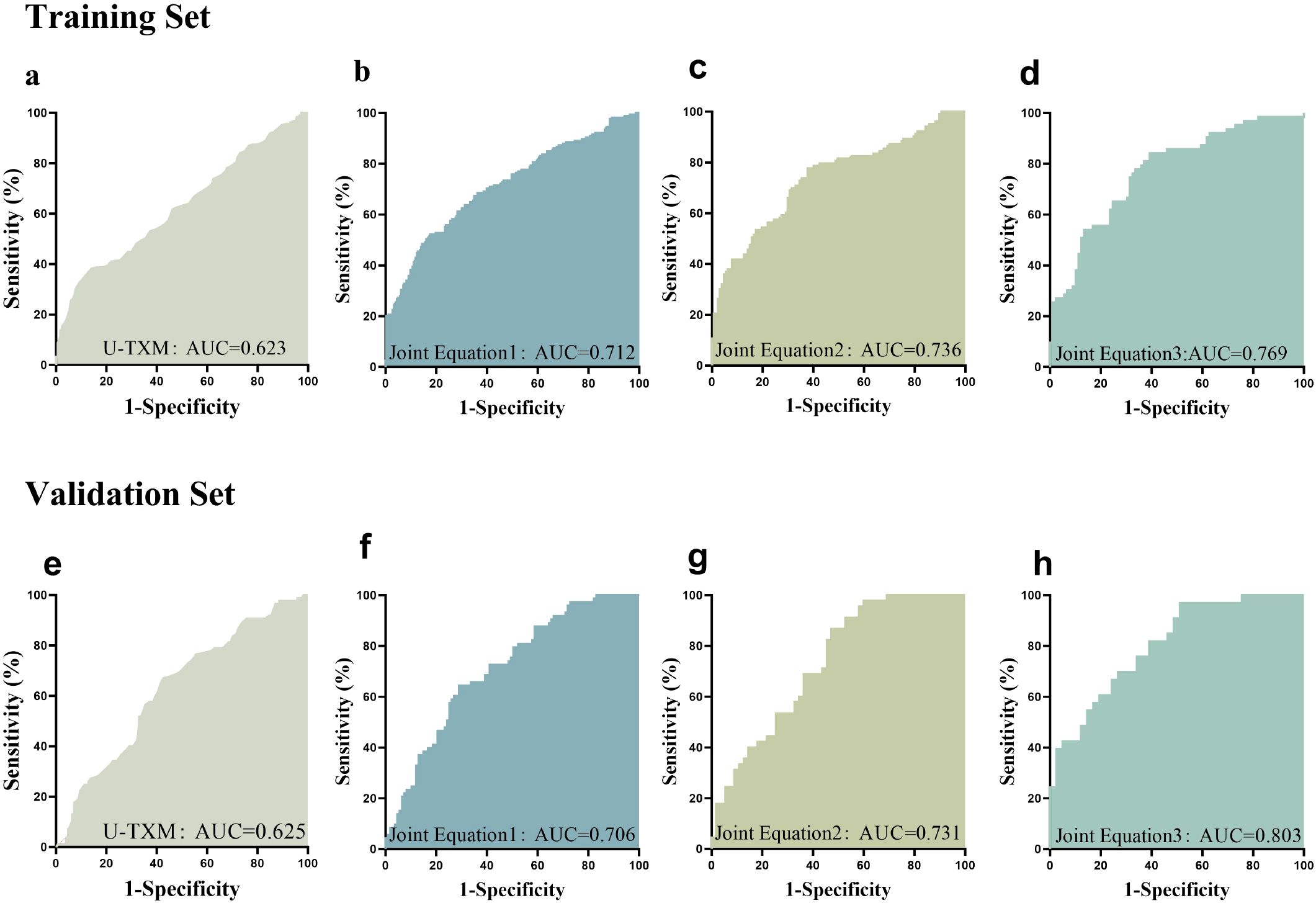 Figure 3. ROC curve analysis. This figure presents the ROC curves evaluating the predictive performance of different variables for the target outcome. The AUC was 0.623 in the training set (a) and 0.625 in the validation set (e). SimultaneousEquation 1: it(P) = -0.424 + 0.768 × Cr + 0.685 × U-TXM. This model achieved an AUC of 0.712 in the training set (b) and 0.706 in the validation set (f). Simultaneous Equation 2: it(P) = -4.438 + 0.903 × Cr - 0.251 × BUN + 0.563 × U-TXM + 0.031 × SBP. The AUC of this model was 0.736 in the training set (c) and 0.731 in the validation set (g). Simultaneous Equation 3: it(P) = -5.733 + 1.051 × Cr - 0.420 × BUN + 0.576 × U-TXM + 0.031 × SBP + 0.054 × BMI - 0.137 × HbA1c + 0.101 × FPG. This model achieved an AUC of 0.769 in the training set (d) and 0.803 in the validation set (h). The x-axis represents 1 - Specificity, while the y-axis represents Sensitivity. Different colored curves indicate different models or variables, with a larger AUC signifying stronger predictive ability. The ROC curve is used to assess the classification performance of different biomarkers or models. AUC values closer to 1 indicate higher predictive accuracy. AUC, area under the curve; ROC, receiver operating characteristic.