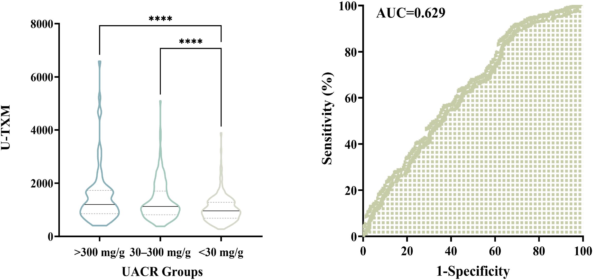 Figure 4. Association between urinary U-TXM levels and UACR groups, and diagnostic utility of U-TXM for DKD progression. Left panel: Violin plot showing the distribution of urinary U-TXM levels across UACR groups: A1 (<30 mg/g), A2 (30–300 mg/g), and A3 (>300 mg/g). U-TXM levels increase progressively from A1 to A3, with statistically significant differences observed between A1 and A2 (P<0.0001), as well as between A1 and A3 (P<0.0001). Right panel: ROC curve for U-TXM in discriminating patients with elevated albuminuria (A2/A3, UACR ≥30 mg/g) from those with normal albumin levels (A1). The AUC is 0.629, indicating statistical significance. These findings highlight the potential of U-TXM as a supplementary biomarker for assessing DKD progression. “****” indicates p < 0.0001, as per our statistical analysis.