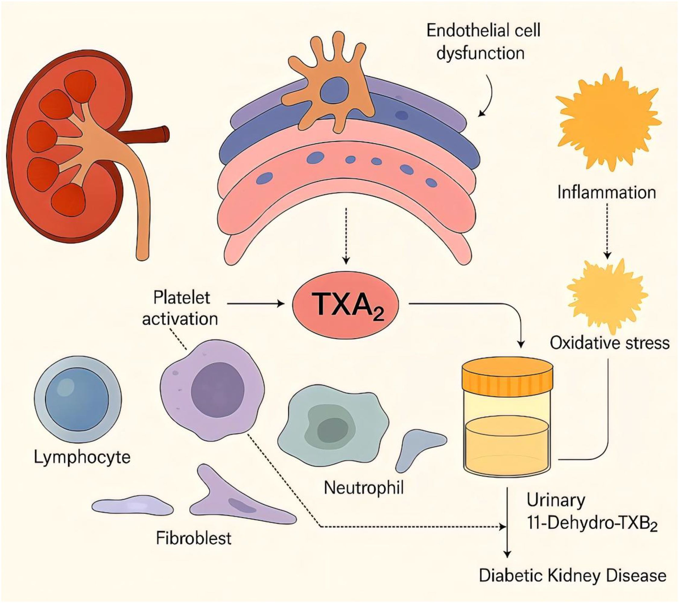Compared with traditional markers, U-TXM offers several advantages: (i) Mechanistic specificity reflecting platelet-immune axis activity; (ii) analytical stability with convenient urinary sampling; (iii) early pathophysiological relevance; and (iv) complementarity with established functional and injury markers. To date, no study has systematically evaluated U-TXM as a mechanism-based biomarker in the context of DKD. In this study, we aim to assess U-TXM as a potential early risk indicator of DKD, highlighting its novelty in bridging platelet-driven inflammation with early renal injury.