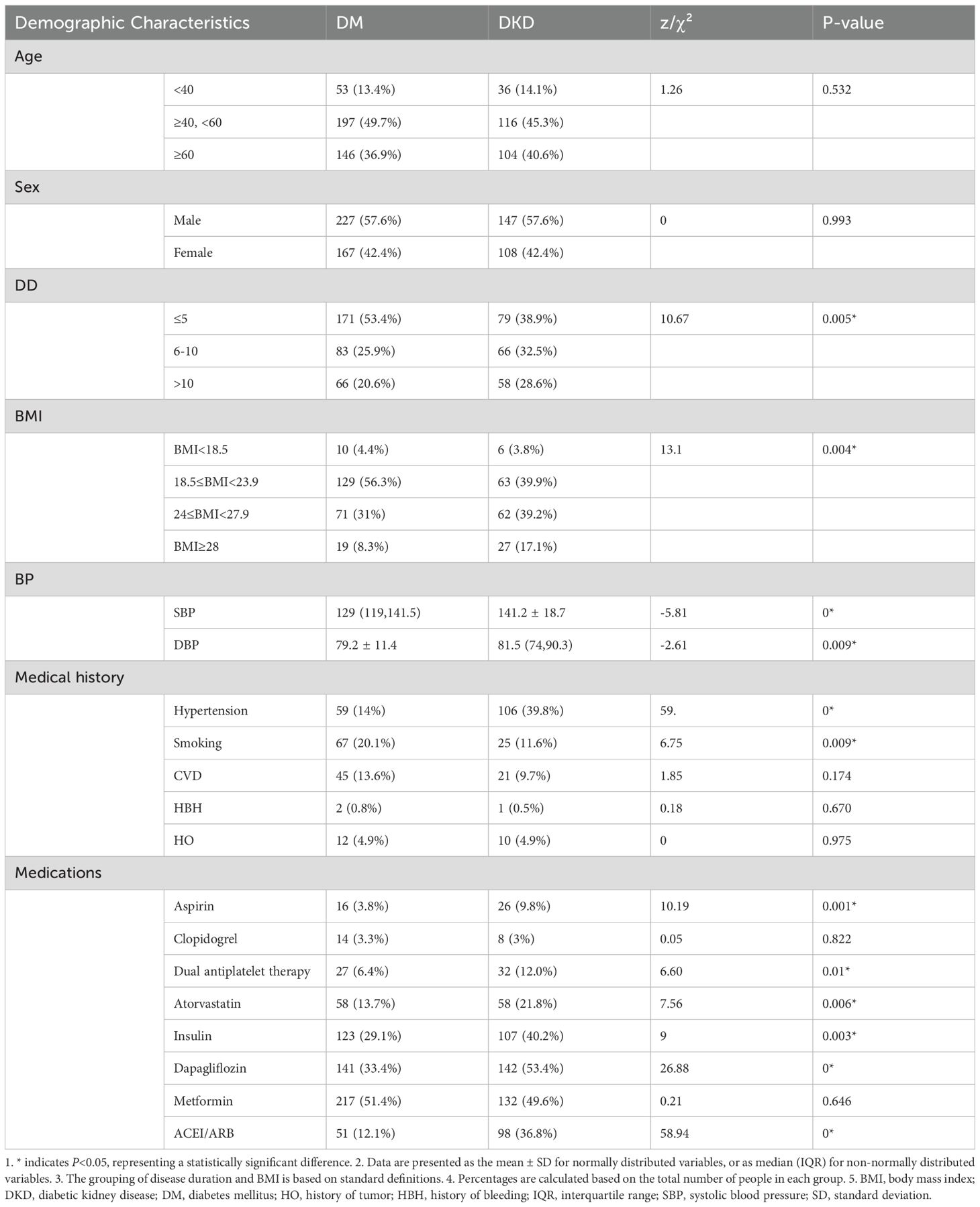 A total of 690 participants were enrolled, including 422 in the DM group and 268 in the DKD group. Baseline demographic and clinical characteristics are summarized in Tables 1, 2. The proportion of males was similar between groups (57.6% in both). Disease duration was shorter in the DM group, with 53.4% of patients in the DM group having ≤5 years compared to 38.9% of patients in the DKD. Conversely, longer durations were more common in the DKD group (6 to 10 years, 32.5% in the DKD group compared to 25.9% in the DM group; >10 years, 28.6% in the DKD group compared to 20.6% in the DM group). Body mass index (BMI) distributions differed: 39.9% of patients in the DKD group and 56.3% in the DM group had a BMI in the range of 18.5 to 23.9; 39.2% in the DKD group and 31.0% in the DM group had a BMI in the range of 24 to 27.9; 17.1% of patients in the DKD group and 8.3% in the DM group had a BMI of 28 or higher.