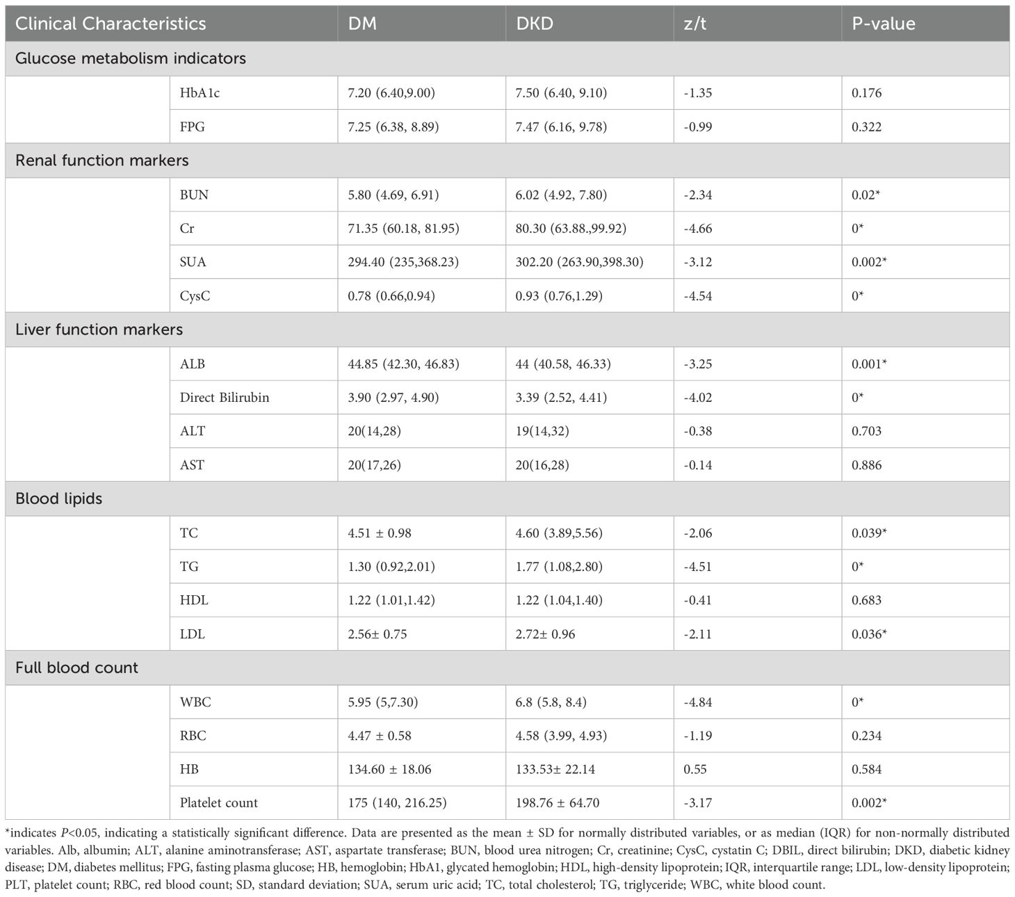 Clinical and laboratory data showed modest differences. Glycemic control was comparable: HbA1c levels in the DKD group were 7.50 (6.40, 9.10), compared to 7.20 (6.40, 9.00) in the DM group; FPG levels in the DKD group were 7.47 (6.16, 9.78), compared with 7.25 (6.38, 8.89) in the DM group. Renal markers were elevated in DKD: BUN levels in the DKD group were 6.02 (4.92, 7.80) compared to 5.80 (4.69, 6.91) in the DM group; serum Cr levels in the DKD and DM groups were 80.30 (63.88, 99.92) and 71.35 (60.18, 81.95), respectively. Platelet counts were higher in the DKD group (200×109[154,232.5]) compared to the DM group (175.00 ×109 [140.00, 216.25]) (Table 2).