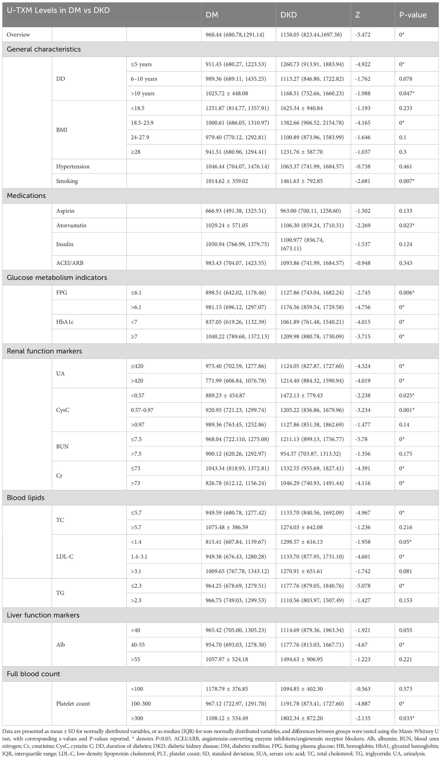 U-TXM levels were significantly higher in the DKD group than in the DM group, as confirmed by stratified analysis. By disease duration (≥5 years), U-TXM levels were significantly higher in the DKD group than in the DM group (Z=-4.92, P<0.001). Similar patterns occurred for BMI (18.5–23.9 kg/m²: Z=-4.16, P<0.001), smoking history (Z=-2.68, P=0.007), and atorvastatin use (Z=-2.26, P=0.023).