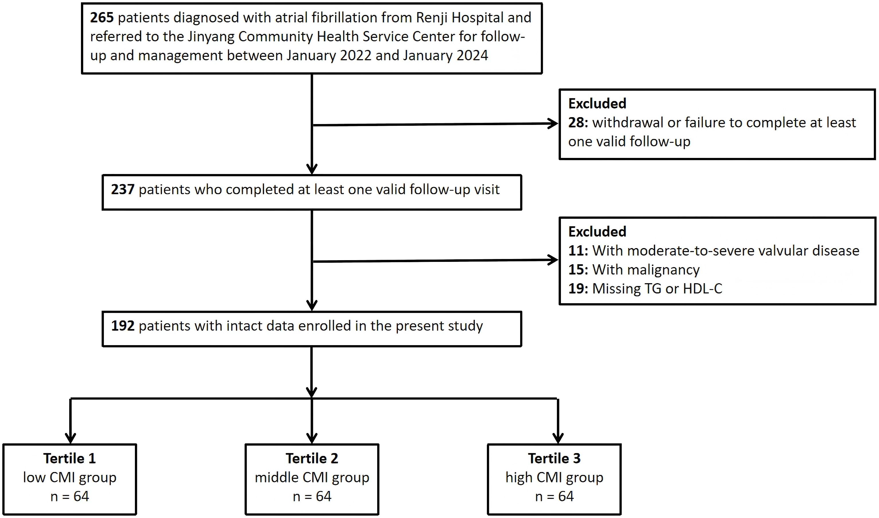This single-center, retrospective cohort study included patients with atrial fibrillation who received chronic disease management follow-up at the Jinyang Community Health Service Center in Shanghai from January 2022 to January 2024. The majority of participants were referred from the Department of Cardiology at Renji Hospital, Shanghai Jiao Tong University School of Medicine, and enrolled in the community-based high-risk population management platform of the regional medical consortium. These patients underwent regular, standardized clinical evaluations and laboratory tests.