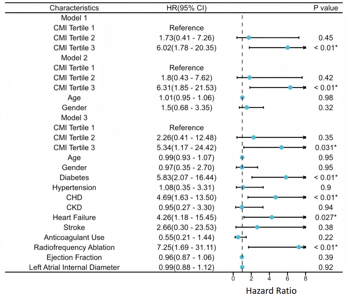 Results: MACE incidence increased significantly with rising CMI levels. Compared to the low CMI group, the high CMI group had a significantly higher risk of MACE (HR = 5.56, 95% CI: 1.48 – 20.90, P = 0.011). Kaplan–Meier analysis showed significant differences in cumulative incidence among the three groups (Log-rank P < 0.001). restricted cubic spline (RCS) modeling revealed a nonlinear positive association, with a sharp increase in MACE risk above a CMI threshold of approximately 0.85 (P for nonlinearity < 0.001). The Extreme Gradient Boosting (XGBoost) model achieved a C-index of 0.737 in the test set, with SHapley Additive exPlanations (SHAP) analysis ranking CMI as the fourth most influential predictor, following age, left atrial diameter, and left ventricular ejection fraction. Subgroup analyses suggested that the predictive value of CMI was particularly evident in patients without chronic kidney disease and those without prior catheter ablation.