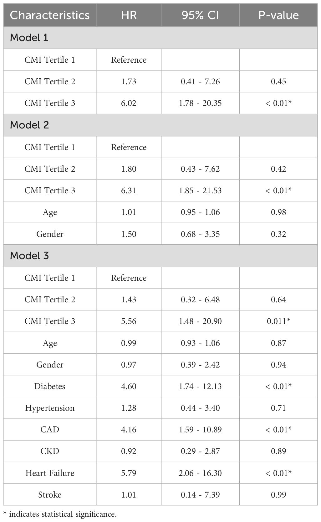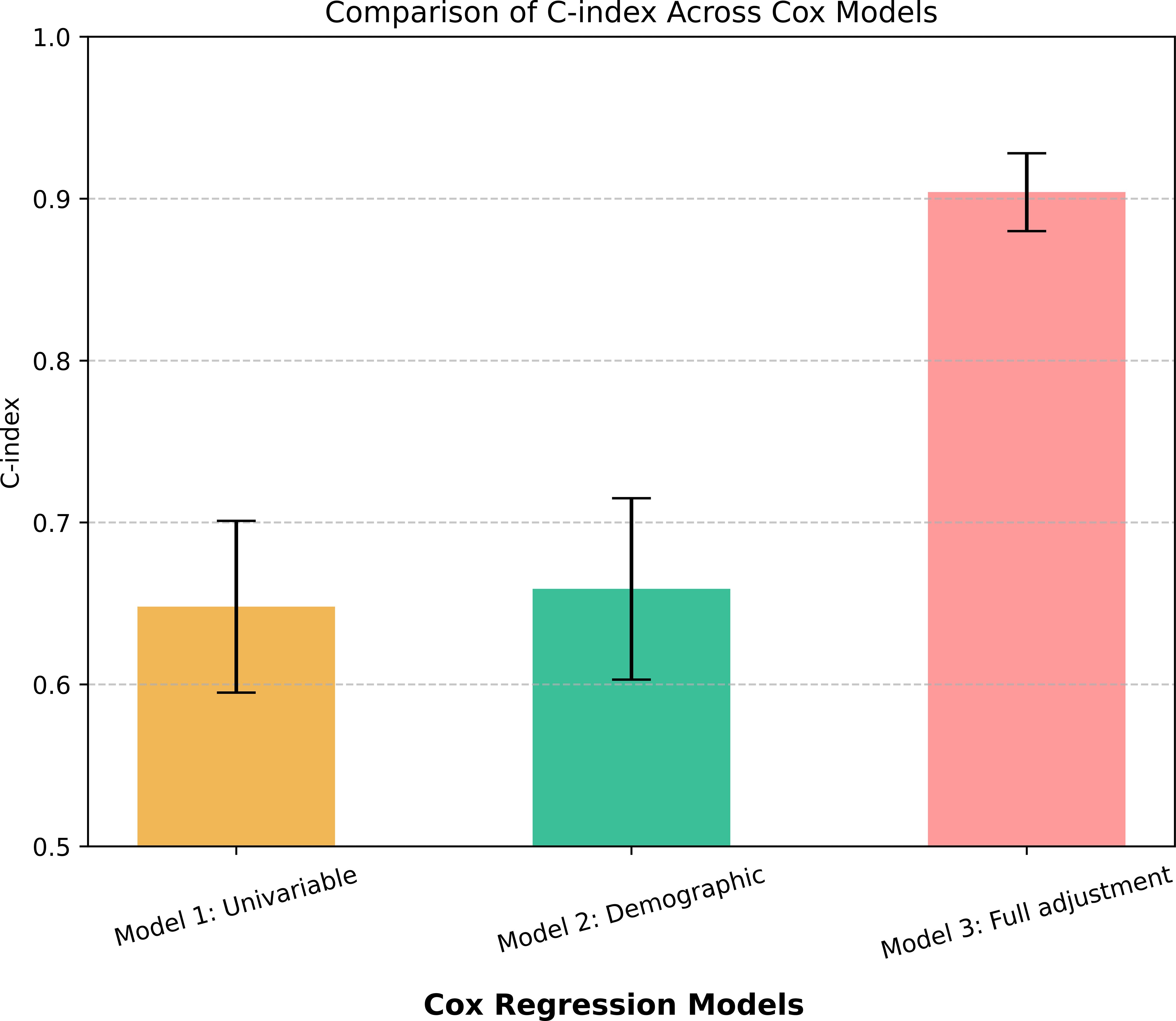 To examine the relationship between CMI and the risk of MACE, three Cox proportional hazards regression models were constructed sequentially. The results are shown in Table 2 and Figure 2. In the unadjusted model, patients in the high CMI tertile had a significantly elevated risk of MACE compared to those in the low CMI group (HR = 6.02, 95% CI: 1.78–20.35, P = 0.004), whereas the medium CMI group showed no significant difference (P = 0.45). After adjustment for demographic variables (age and sex), the high CMI group continued to exhibit significantly increased MACE risk (HR = 6.31, 95% CI: 1.85–21.52, P = 0.003), while age and sex themselves were not statistically significant predictors (P > 0.05). The medium CMI group remained non-significant (P = 0.42). In the fully adjusted model, which incorporated additional covariates including comorbid conditions (hypertension, CAD, CKD, heart failure, prior stroke), the high CMI group retained a significantly elevated risk of MACE (HR = 5.56, 95% CI: 1.48–20.90, P = 0.011). The medium CMI group demonstrated a non-significant upward trend (P = 0.64), reinforcing high CMI as an independent risk factor for adverse cardiovascular outcomes. Other variables identified as significant predictors of MACE in the final model included diabetes (HR = 4.60, 95% CI: 1.74–12.13, P < 0.01), coronary artery disease (HR = 4.16, 95% CI: 1.59–10.89, P < 0.01), heart failure (HR = 5.79, 95% CI: 2.06–16.30, P < 0.01). Regarding model performance, the C-index—a measure of discrimination—was 0.648 ± 0.053 for Model 1, 0.659 ± 0.056 for Model 2, and increased substantially to 0.882 ± 0.029 for the fully adjusted Model 3 (Figure 3), indicating excellent accuracy in differentiating high- and low-risk patients.