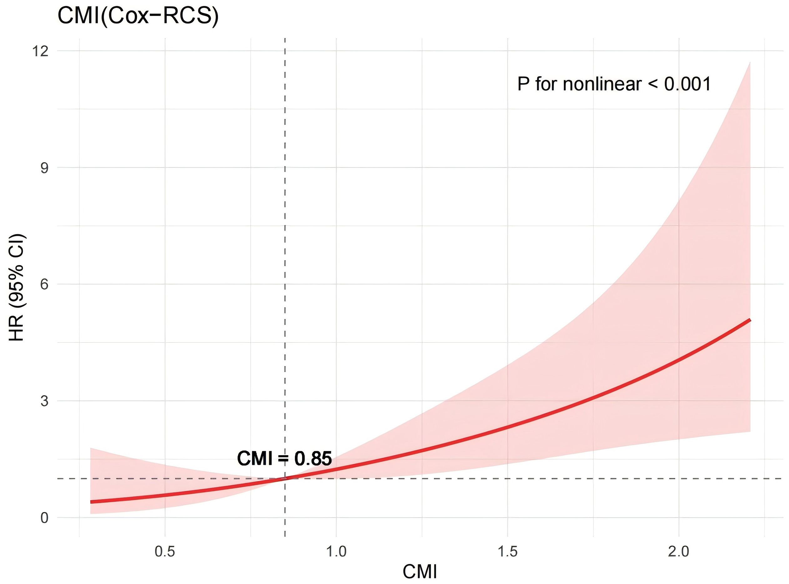 To further explore the association between CMI levels and MACE risk, Kaplan–Meier survival curves were plotted, and differences in event rates among the three groups were assessed using the Log-rank test (Figure 4). Over the follow-up period, the cumulative incidence of MACE increased progressively across the CMI tertiles. The high CMI group exhibited the highest cumulative incidence, followed by the medium and low groups. The Log-rank test confirmed that the differences among the survival curves were statistically significant (P < 0.001). Throughout the observation period, the low CMI group consistently showed the lowest risk of events, the medium group displayed an intermediate risk, and the high CMI group experienced the greatest concentration of events. These findings suggest a positive correlation between higher CMI levels and increased MACE risk. To investigate the potential nonlinear relationship between CMI and MACE, a RCS model was constructed (Figure 5). The analysis revealed a nonlinear positive association between CMI and MACE risk (P for nonlinearity < 0.001). An inflection point was identified at approximately CMI = 0.85. Below this threshold, the risk increased gradually; beyond 0.85, the risk rose sharply and continued to escalate with increasing CMI levels. This nonlinear dose-response relationship highlights the potential threshold effect of CMI in predicting cardiovascular risk.