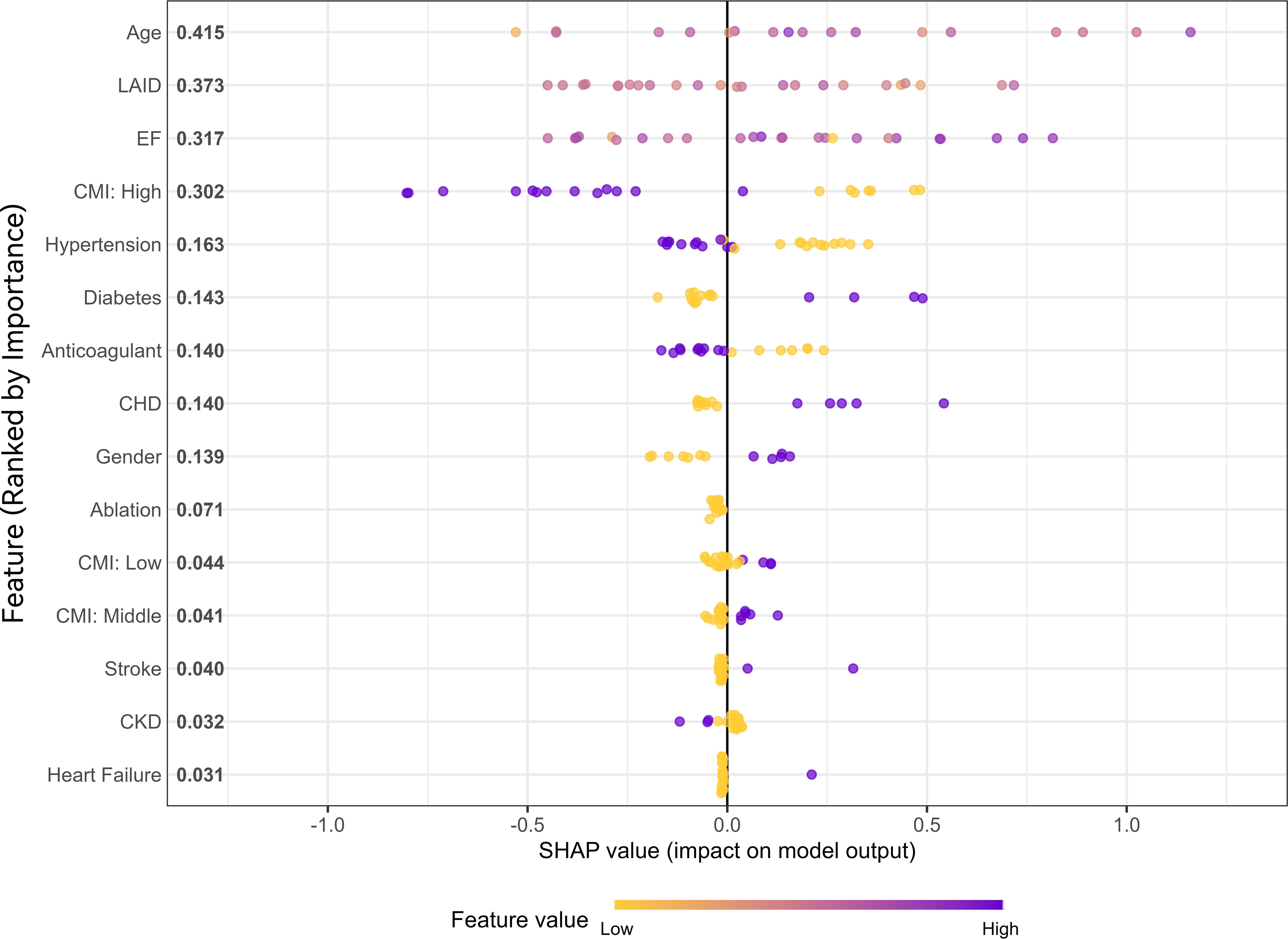 To further enhance the predictive accuracy for MACE outcomes and investigate the relative importance of input features, an XGBoost model was developed. The entire dataset was randomly divided into a training set and a testing set at a ratio of 8:2. Model hyperparameters were optimized using ten-fold cross-validation within the training set. In terms of predictive performance, the XGBoost model achieved a C-index of 0.737 on the testing set. While this performance exceeded that of the unadjusted and demographic-only Cox regression models, it remained lower than that of the fully adjusted Cox model. To improve model interpretability, SHAP were applied to quantify the marginal contribution of each variable to the model’s output (Figure 6). Based on mean SHAP values, the top four predictors were age (mean SHAP: 0.415), LAID (0.373), LVEF (0.317), and high CMI category (0.302), indicating that both structural cardiac parameters and metabolic status significantly influenced model predictions. Other key contributors included hypertension, diabetes, anticoagulation therapy, and coronary artery disease.