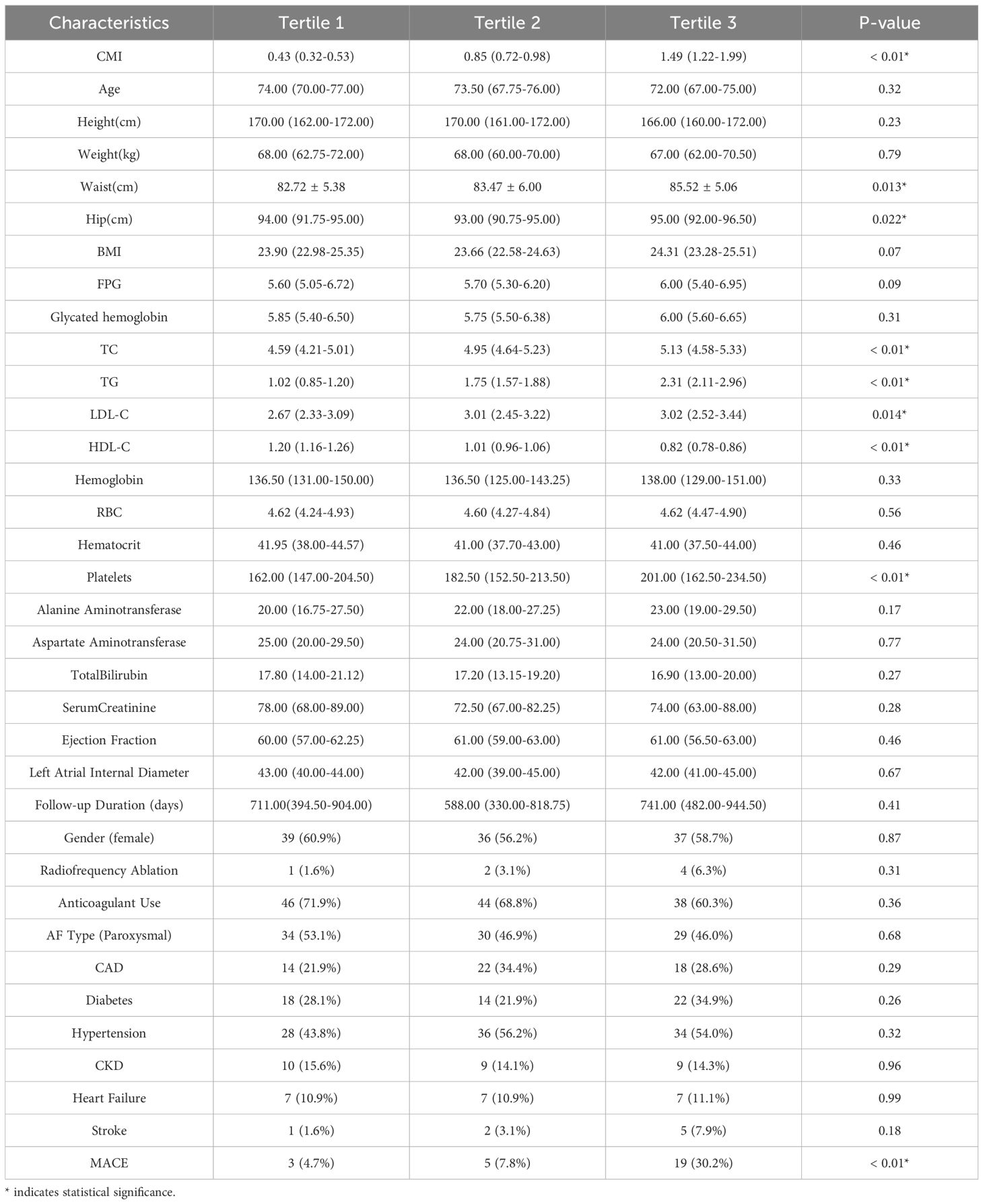 A total of 192 patients with AF were included in the analysis. Based on baseline CMI levels, patients were divided into tertiles, with the lowest tertile serving as the reference group in Cox proportional hazards regression models. Baseline characteristics across the three CMI groups are summarized in Table 1. There were no statistically significant differences in age, height, weight, BMI, fasting plasma glucose, or glycated hemoglobin among the groups (all P > 0.05). However, waist circumference (P = 0.013) and hip circumference (P = 0.022) increased significantly with higher CMI levels, indicating a progressively stronger pattern of central obesity. Significant differences were also observed in metabolic parameters. Triglyceride levels were notably higher in the high CMI group compared to the low and middle groups (1.02 [0.85–1.20] mmol/L, 1.75 [1.57–1.88] mmol/L, and 2.31 [2.11–2.96] mmol/L, respectively; P < 0.01). In contrast, HDL-C levels declined markedly across tertiles (1.20 [1.16–1.26] mmol/L, 1.01 [0.96–1.06] mmol/L, and 0.82 [0.78–0.86] mmol/L, respectively; P < 0.01). Both total cholesterol and LDL-C also differed significantly among groups (P < 0.01 and P = 0.014, respectively). No significant intergroup differences were observed for hemoglobin levels or liver and renal function markers (all P > 0.05). During follow-up, the incidence of MACE varied significantly across CMI groups (P < 0.001). The MACE rates were 4.7% (3 cases), 7.8% (5 cases), and 30.2% (19 cases) in the low, medium, and high CMI groups, respectively, indicating a substantially elevated cardiovascular risk among patients with the highest CMI.