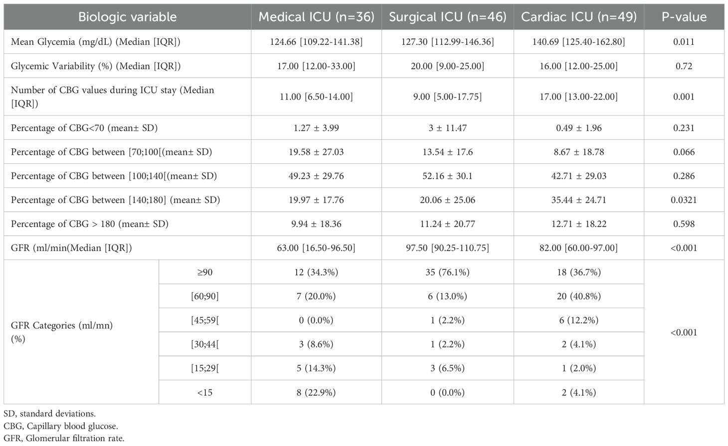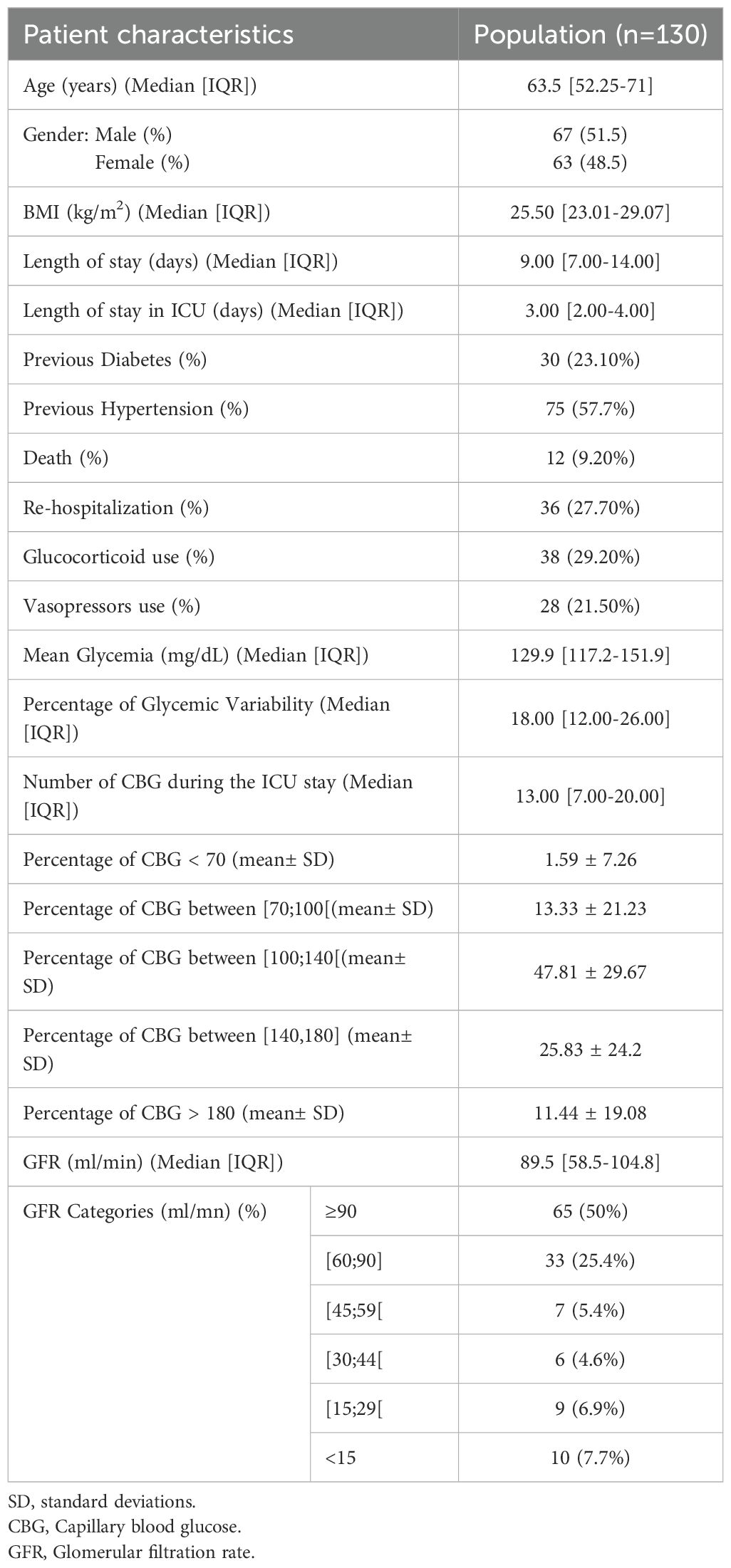 This retrospective observational study included all patients admitted to the medical, surgical, and cardiovascular ICUs at Hôtel-Dieu de France (HDF) hospital who underwent capillary blood glucose (CBG) monitoring during their stay. Because CBG monitoring was systematically performed in all ICU patients, no exclusion criteria were applied. We reviewed the medical records of patients hospitalized at the ICUs during July and August 2024 and collected the following demographic, clinical, and biological data: age, gender, weight in kilograms (kg), height in meter (m), history of diabetes or hypertension (HTN), corticosteroid or vasopressor uses, total hospital LOS, ICU LOS, in-hospital mortality, and hospital readmission within six months after discharge. A prior history of diabetes or HTN was determined from patient records and medication lists at admission. Body mass index (BMI) was calculated using the formula: weight (kg)/height² (m²). CBG and GFR values were also retrieved. CBG measurements were routinely performed for all ICU patients, with a frequency ranging from 3 to 12 measurements per day depending on clinical needs. MG was calculated for each patient as the arithmetic mean of all CBG values (sum of values/number of values). GV was assessed using the coefficient of variation (CV), expressed as a percentage: CV (%) = (Standard Deviation of blood glucose/Mean blood glucose) × 100. Because this study was retrospective, glucose monitoring frequency was not standardized. To account for this, we used the CV to describe glucose variability, calculated as the ratio of the standard deviation to the mean of all available measurements. For each patient, CBG was categorized into 5 categories as follows:<70 mg/dL; 70–99 mg/dL; 100–139 mg/dL; 140–180 mg/dL; >180 mg/dL. GFR was calculated using the CKD-EPI formula, and expressed in mL/min. GFR was classified according to the 2024 KDIGO guidelines (23) into the following categories: ≥90 mL/min: normal or high GFR; 60–89 mL/min: mild decrease in GFR; 45–59 mL/min: mild to moderate decrease in GFR; 30–44 mL/min: moderate to severe decrease in GFR; 15–29 mL/min: severe decrease in GFR; <15 mL/min: kidney failure. The CKD-EPI formula was defined as: GFR = 141×(min(κScr,1))α×(max(κScr,1))−1.209×(0.993) Age×[1.018 if female], Where: κ = 0.7 (female), 0.9 (male) and α = –0.329 (female), –0.411 (male).