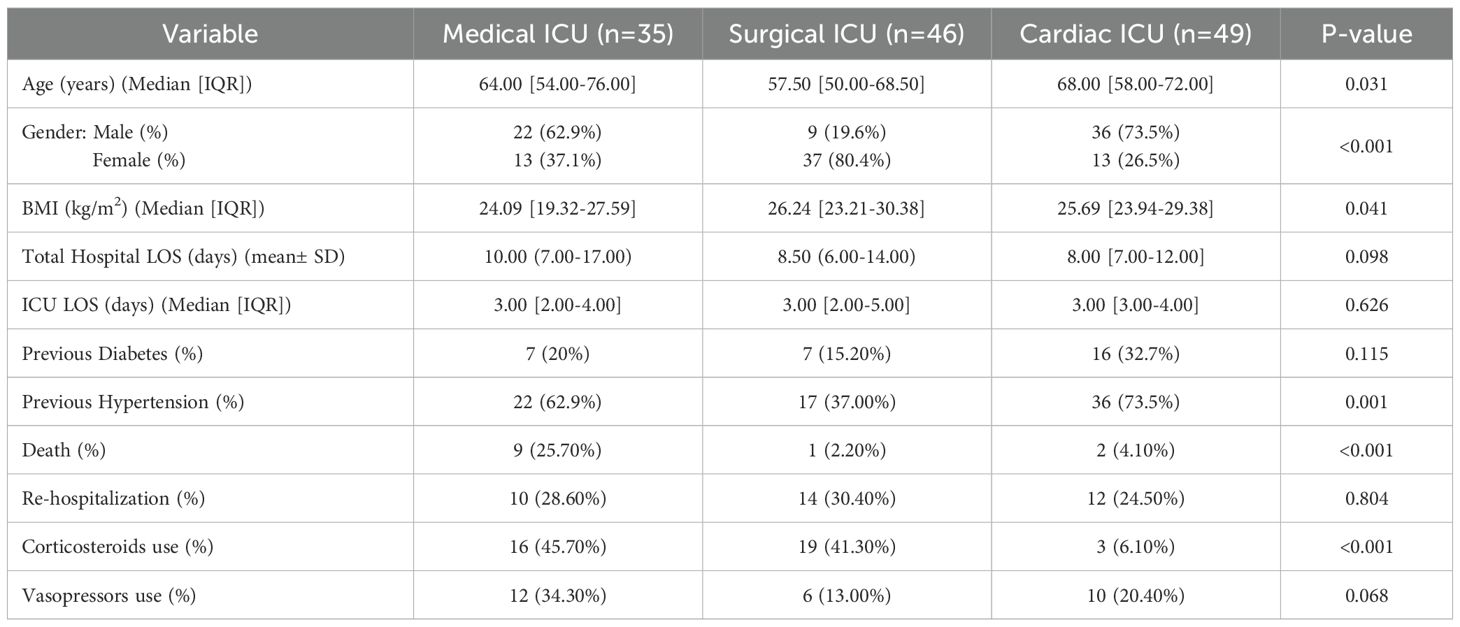 During the study period, 130 patients were admitted to the ICUs: 35 to the medical ICU, 46 to the surgical ICU, and 49 to the cardiovascular ICU. Their demographic and clinical characteristics are presented in Table 1. The median age of the overall cohort was 63.5 years [52.25-71], with 51.5% of patients being men. The median MG was 129.9 mg/dL [117.2-151.9], and median GV was 18% (12–26). When stratified by ICU subunit (Table 2), age was significantly higher in the cardiovascular ICU (p=0.031). Significant differences were also observed across the three ICUs for BMI (p = 0.041), history of HTN (p = 0.001), and corticosteroid use (p <0.001). When comparing according to gender, men had a significantly higher prevalence of pre-existing HTN (p = 0.03), whereas women showed significantly higher corticosteroid use (p = 0.03). No significant differences were observed by gender for BMI.