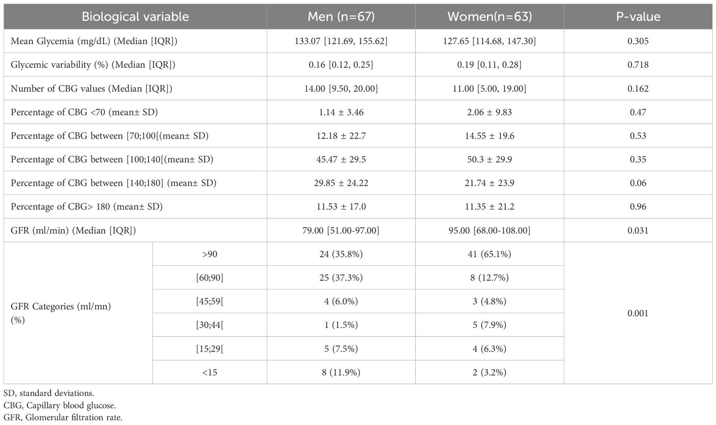 During their ICU stay, 79.2% of patients developed hyperglycemia (defined as at least one CBG > 140 mg/dL), with observed rates of 74.3%, 71.7%, and 89.8% in the medical, surgical, and cardiovascular ICUs, respectively. Although these differences were not statistically significant, a trend toward higher rates in the cardiovascular ICU was noted (p = 0.067). The distribution of biological variables according to ICU type is summarized in Table 3. Median MG levels differed among ICU subunits, with the highest values observed in the cardiovascular ICU (140.69 mg/dL), compared to 124.66 mg/dL in the medical ICU and 127.30 mg/dL in the surgical ICU (p = 0.011). In contrast, no significant differences were observed in median GV levels (medical ICU: 17%, surgical ICU: 20%, cardiovascular ICU: 16%). A significant difference in GFR was noted across the three different ICUs (p < 0.001). Comparisons by gender showed no significant differences in MG or in GV (p = 0.3 and p = 0.7, respectively) (Table 4).