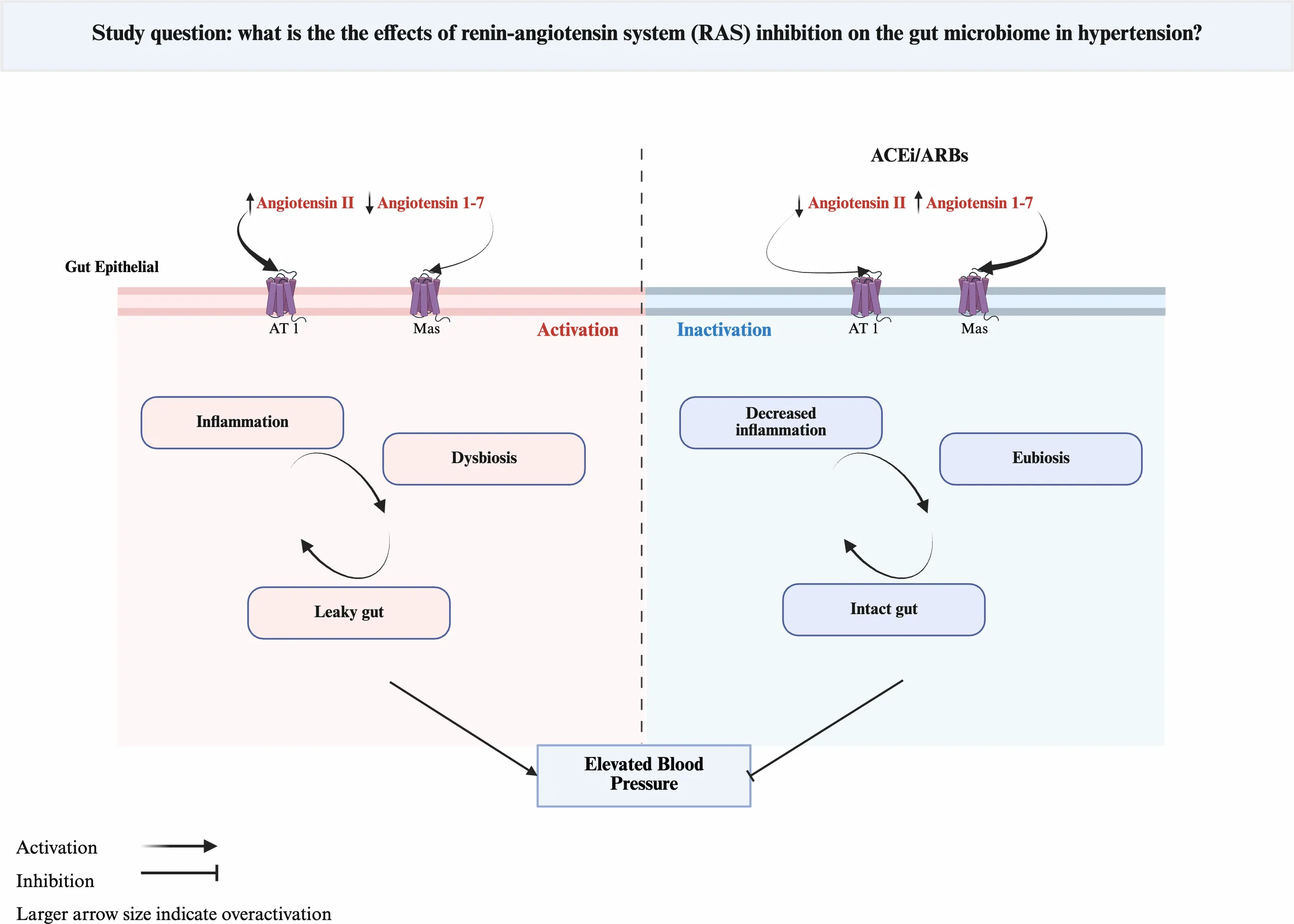 Key considerations regarding the findings of this review merit attention. First, the interaction between RAS inhibition and the gut microbiome may depend on the pharmacokinetics of specific RASs’ inhibitors (e.g., ACEis/ARBs) and components (e.g., Ang II). While most RAS inhibitors consistently benefited the gut, valsartan showed conflicting results, reducing microbial diversity without improving barrier integrity (32). One hypothesis for this could be attributed to difference in methodology or inherent valsartan properties and would require validation in future studies. Notably, valsartan has lower bioavailability compared to other ARBs, and it was administered intragastrically in this study, unlike the oral administration used in the remaining studies (47). Further research is needed to determine whether the gut benefit of RAS inhibitors is a class effect. Second, the beneficial effects of RAS inhibition appear to involve both systemic and local RAS signaling. Ang II has a longer tissue half-life (~15 minutes) than its plasma half-life (~1 minute), underscoring the significance of local RAS activity (13, 48). Moreover, the most pronounced gut benefits were observed with prolonged candesartan treatment, emphasizing the chronic nature of Ang II-driven gut dysbiosis and pathology (17). It is important to note that Ang II is not inherently harmful. Physiological levels and acute elevations are critical for maintaining vascular tone and fluid balance (49). Third, although the hypotensive effect of RAS inhibitors could improve gut health, it is likely not sufficient. Robles et al. tested this theory, where the administration of hydralazine to SHR rescued BP but did not affect gut composition and colonic integrity, suggesting that the anti-inflammatory effect of ACEi and ARBi is likely RAS dependent. Finally, the influence of Ang II on the microbiome may be affected by experimental factors, such as diet, sampling size, and housing facility (50).