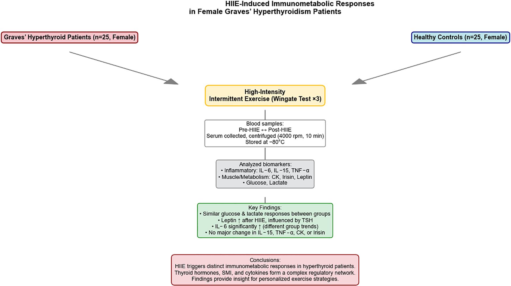 Conclusion: This study, for the first time, systematically evaluated immunometabolic responses in female Graves’ hyperthyroidism patients following HIIE. While muscle loss in newly diagnosed hyperthyroidism patients did not significant impair short-term explosive power, it may reduce endurance during sustained high-intensity exercise. The hyperthyroid state markedly altered exercise-induced immunometabolic dynamics, underscoring the need for comprehensive consideration of hyperthyroidism’s complex physiological impact when designing personalized exercise regimens.