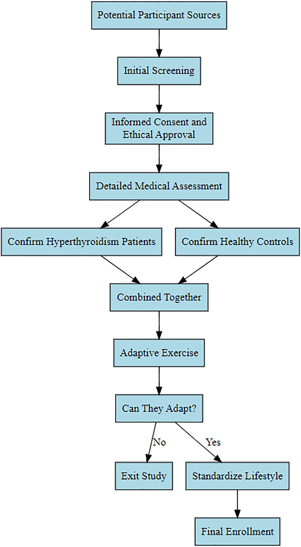 First-visit Graves’ hyperthyroidism patients admitted to the East Medical District of Linyi People’s Hospital in 2017 were selected as the observation group. All participants were enrolled after screening based on inclusion and exclusion criteria. Following enrollment, participants underwent adaptive exercise for the Wingate test; those unable to participate were withdrawn. Ultimately, 25 female participants were selected for the study. Due to the relatively small number of male patients and fewer willing male participants, the study exclusively focused on female Graves’ hyperthyroidism patients. Subsequently, 25 healthy females were selected as a control group based on inclusion/exclusion criteria and adaptive exercise (refer to Figure 1 for the specific screening process). This study received approval from the Medical Ethics Committee of Linyi People’s Hospital (Ethics Approval No.: KY2017015). All participants voluntarily joined the study after reviewing the informed consent form. They all maintained a consistent lifestyle for one week, during which patients were prohibited from consuming high-sugar, high-fat diets or snacks. Daily sleep was from 23:00 to 7:00 the following day, and strenuous physical activity and exercise training were avoided.