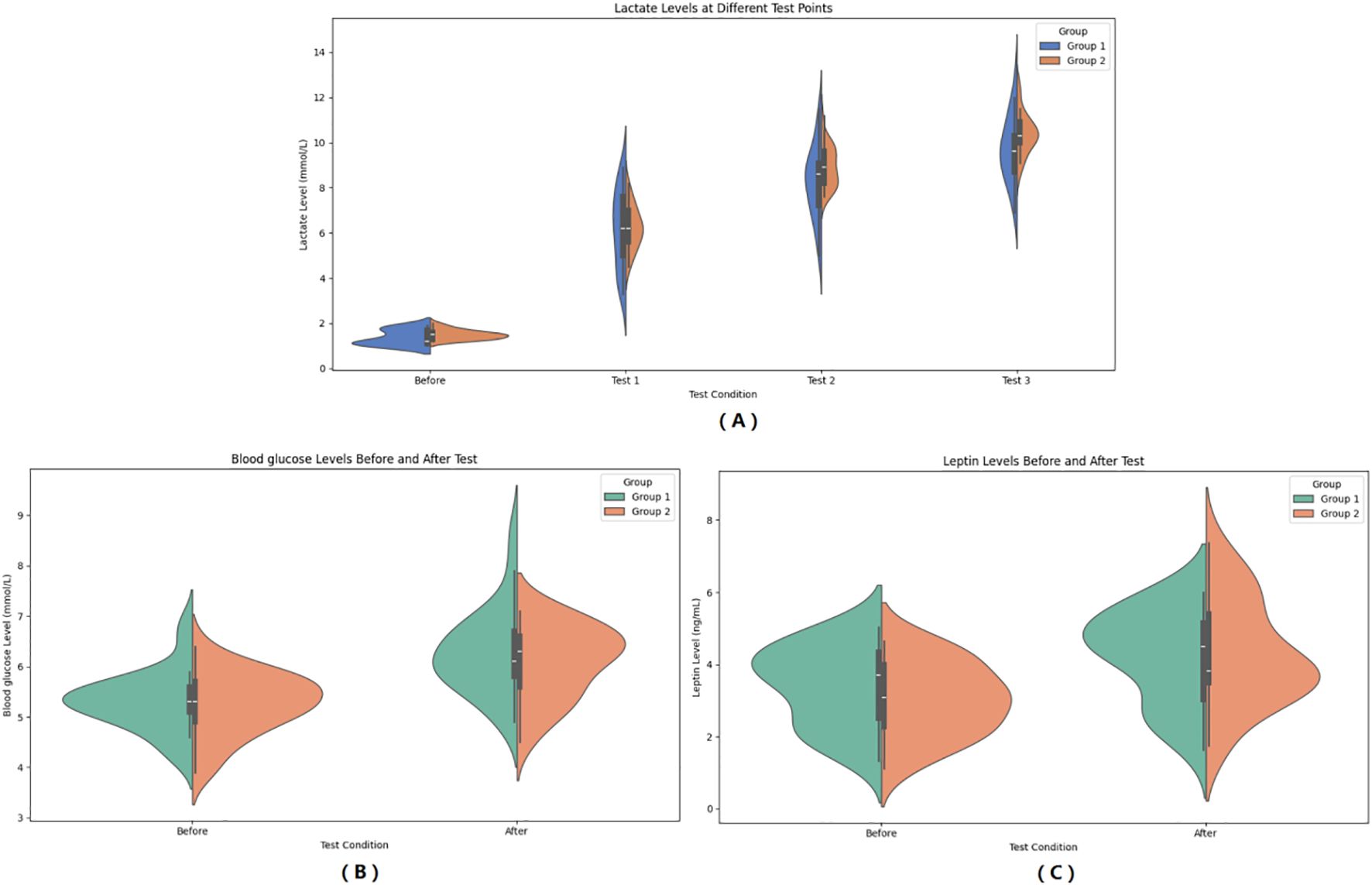 Figure 2. Pre- and Post-HIIE changes in metabolic indicators: Blood Lactate (A), Blood Glucose (B), and Leptin (C). (A) Changes in blood lactate levels at different test points (Before, Test 1, Test 2, Test 3). (B) Comparison of blood glucose levels before and after HIIE. (C) Comparison of serum leptin levels before and after HIIE. Group 1: Control group; Group 2: Graves’ disease group. Data are presented as violin plots showing the distribution, median, and interquartile range.