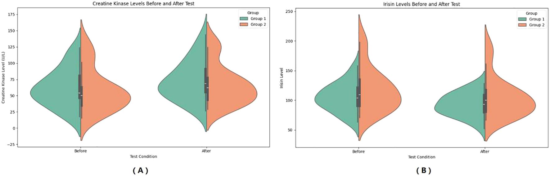 Figure 3. Pre- and Post-HIIE changes in muscle-related indicators: CK (A) and Irisin (B). (A) Serum creatine kinase (CK) levels before and after the test. (B) Serum irisin levels before and after the test. Group 1: Control group; Group 2: Graves’ disease group. Data are expressed as violin plots showing the distribution and central tendency of each variable.