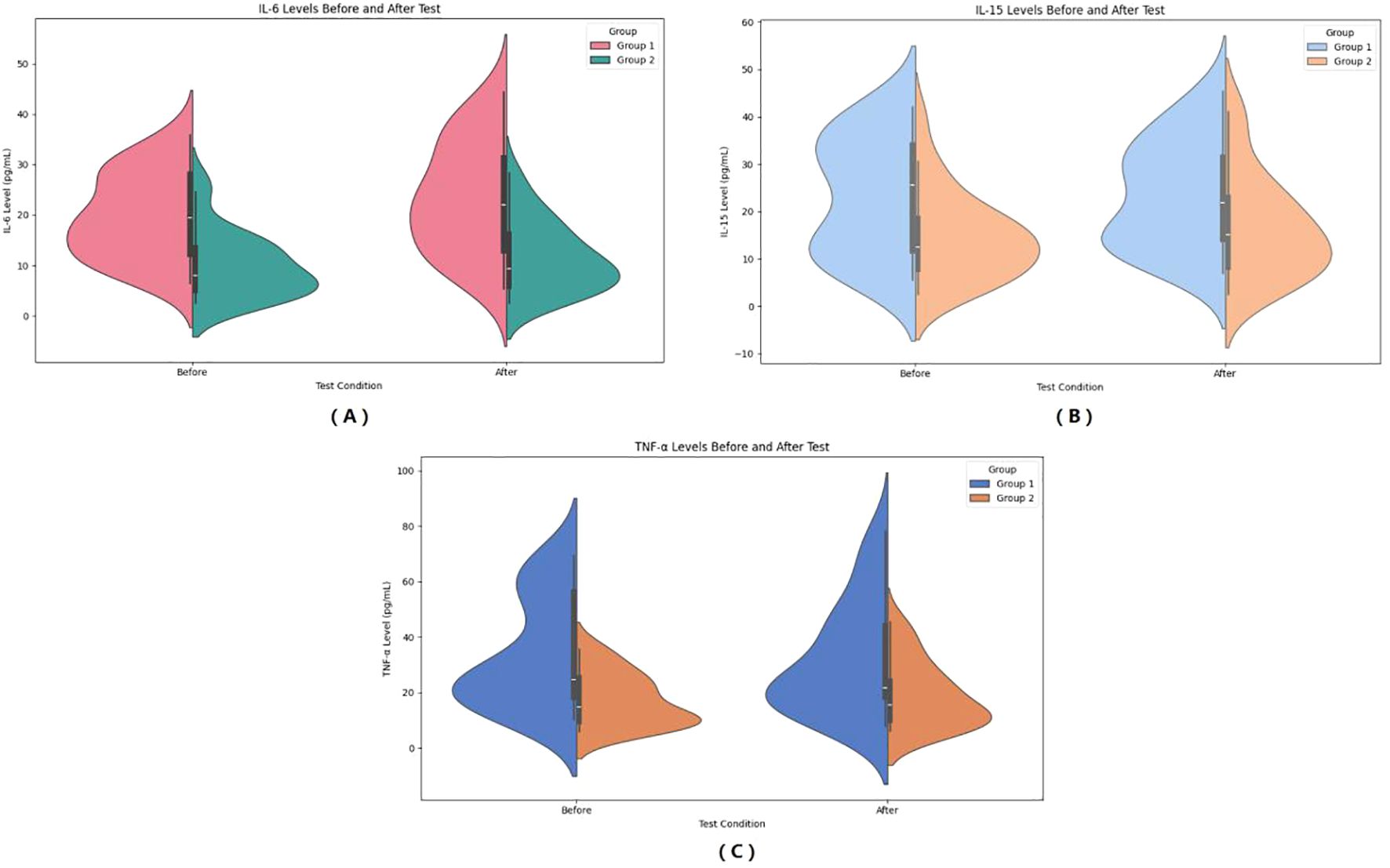 Figure 4. Pre- and post-HIIE changes in inflammatory indicators: IL-6 (A), IL-15 (B), and TNF-α (C). (A) Serum IL-6 levels before and after the test. (B) Serum IL-15 levels before and after the test. (C) Serum TNF-α levels before and after the test. Group 1: Control group; Group 2: Graves’ disease group. Data are shown as violin plots, demonstrating data distribution, median, and variability before and after exercise.