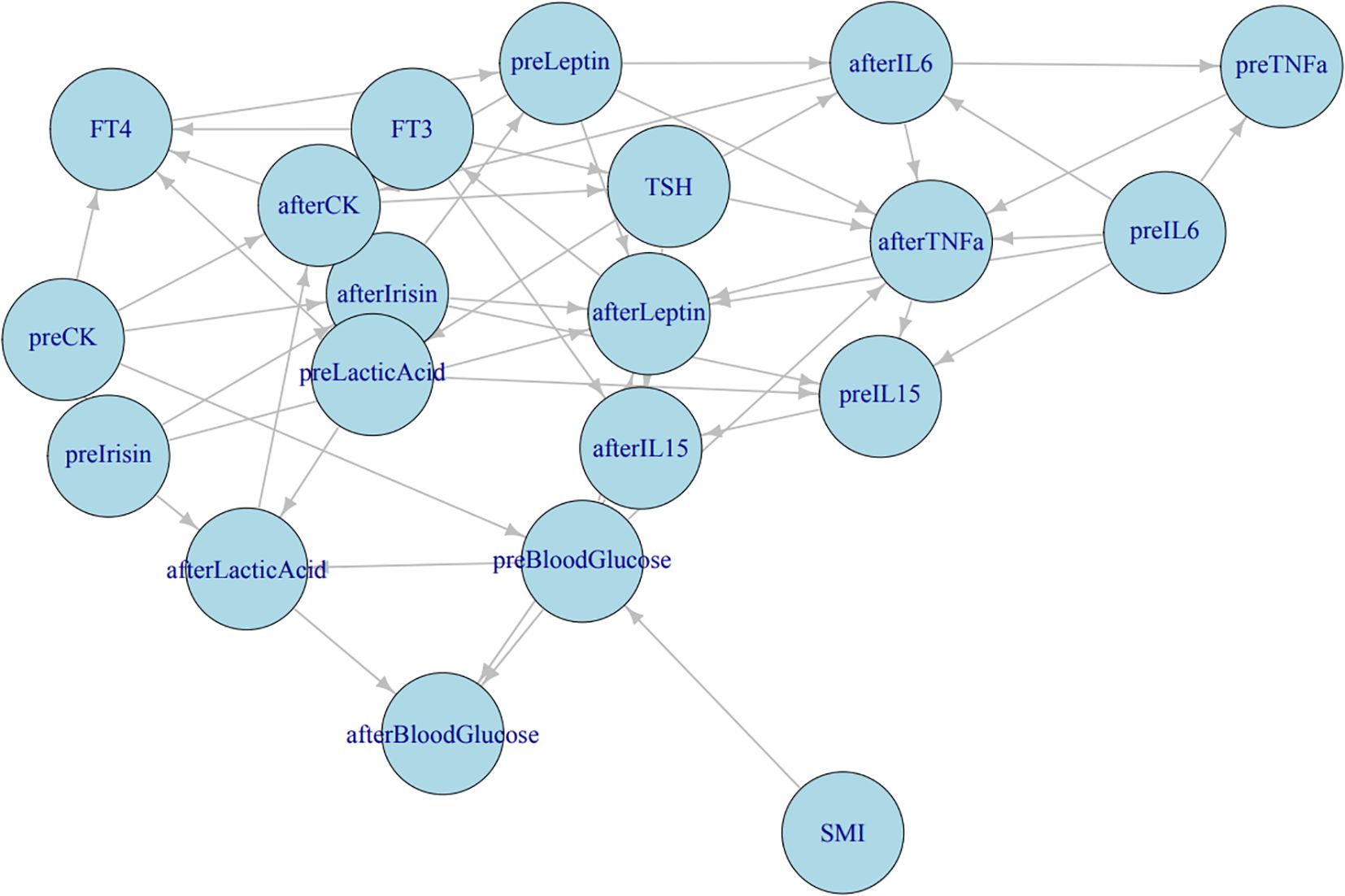 We constructed comprehensive Bayesian networks for both the observation group and the control group. Each network comprised 23 nodes and several edges, with nodes representing different variables, including SMI, FT3, FT4, TSH, and various parameters observed during HIIE. The results indicate that FT3 may influence post-HIIE IL-15; FT4 affects post-HIIE IL-6 release by influencing pre-HIIE leptin, and the increase in post-HIIE IL-6 may, in turn, affect TNF-α. TSH’s influence on post-HIIE IL-6, IL-15, and TNF-α suggests its significant role in regulating inflammatory responses. SMI may affect pre-exercise blood glucose levels and indirectly influence post-exercise blood glucose levels. After exercise, the body’s ability to process blood glucose might be influenced by SMI. A higher SMI may contribute to more effective regulation of blood glucose levels post-exercise. (See Figure 5).