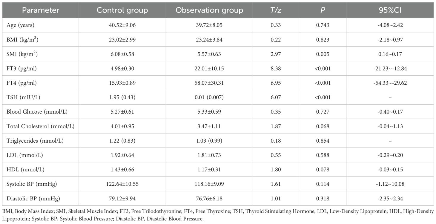 Apart from differences in thyroid-related hormones (thyroid hormone FT3 and FT4 levels were significant higher in the observation group than in the control group, P < 0.001; while TSH levels were significant lower in the observation group than in the control group, P < 0.001), the observation group’s SMI was significant lower than that of the control group (P = 0.005). Other parameters such as age, BMI, blood glucose, cholesterol, low-density lipoprotein, and high-density lipoprotein showed no significant differences. (See Table 1).