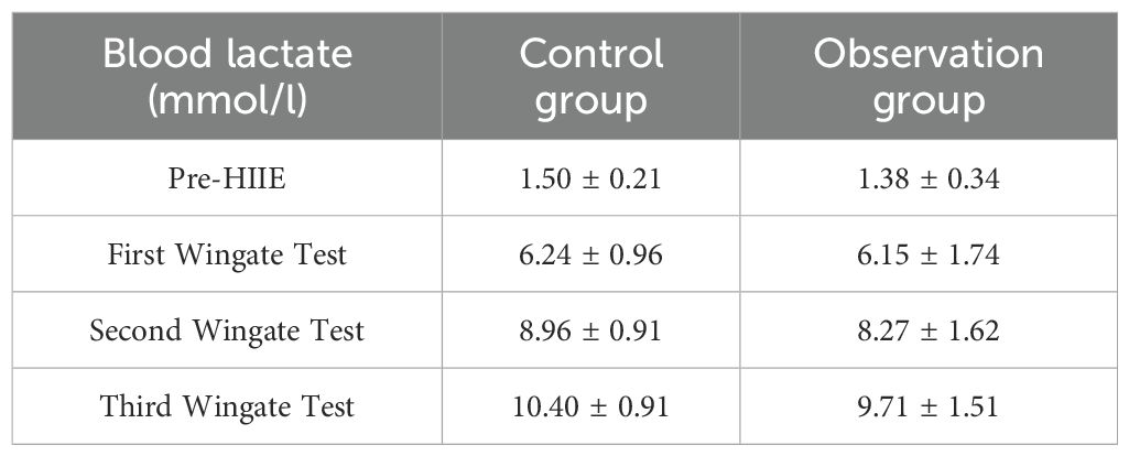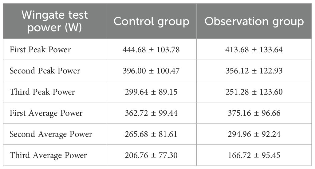 In terms of HIIE exercise power, this study found no significant differences in the absolute levels of either peak power or mean power between the two groups across three Wingate tests. However, for mean power, we observed a significant “Times by group interaction,” indicating a notable difference in the trend of mean power decline between the two groups. Specifically, as the number of tests increased, both peak power and mean power in both groups significant decreased, which is consistent with the characteristics of HIIE, where accumulated exercise fatigue leads to a decline in exercise performance.