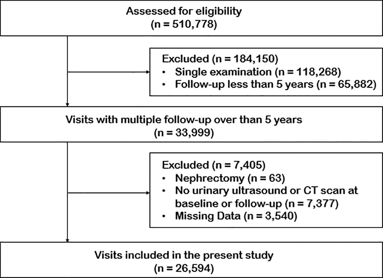The study population was derived from a large dataset of physical examinations in Peking Union Medical College Hospital between 1994 and 2024, encompassing 510,778 visits. From this initial pool, 118,268 visits were identified as single examinations, while 392,510 visits (representing 99,881 individuals) involving multiple follow-ups were included in the following analysis. To ensure the robustness of the analysis, the study focused on individuals with follow-up periods exceeding five years, resulting in a subset of 33,999 participants. Exclusion criteria were applied to refine the cohort: individuals who underwent nephrectomy (n = 63), those without baseline or follow-up urinary ultrasound or CT scans (n = 7,377), and those with missing data (n = 3,540) were excluded. After applying the criteria, the final study cohort comprised 26,594 individuals. The median follow-up time was 71 months (IQR: 61–82 months) (Figure 1).