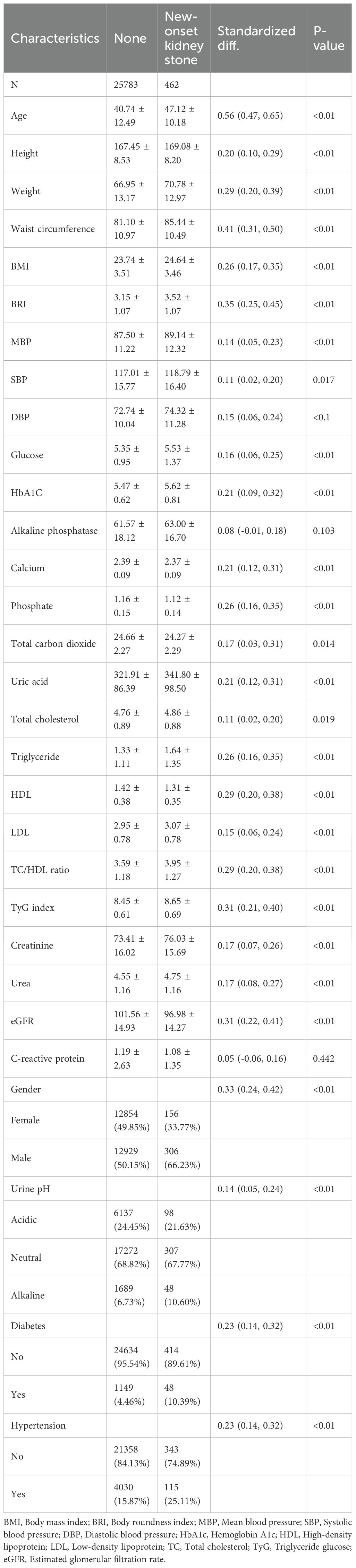 We presented the baseline characteristics of the study population in Table 1. The study included 25,783 individuals without kidney stones and 462 with new-onset kidney stones. Participants with new-onset kidney stones were significantly older (47.12 ± 10.18 years vs. 40.74 ± 12.49 years, p<0.01). Their anthropometric measures concerning metabolic status were higher than those without kidney stones, including weight (70.78 ± 12.97 kg vs. 66.95 ± 13.17 kg, p<0.01), waist circumference (85.44 ± 10.49 cm vs. 81.10 ± 10.97 cm, p<0.01), BMI (24.64 ± 3.46 vs. 23.74 ± 3.51, p<0.01), and BRI (3.52 ± 1.07 vs. 3.15 ± 1.07, p<0.01). Additionally, individuals with new-onset kidney stones exhibited higher mean blood pressure (89.14 ± 12.32 mmHg vs. 87.50 ± 11.22 mmHg, p<0.01), higher SBP (118.79 ± 16.40 mmHg vs. 117.01 ± 15.77 mmHg, p=0.017), and DBP (74.32 ± 11.28 mmHg vs. 72.74 ± 10.04 mmHg, p<0.01).