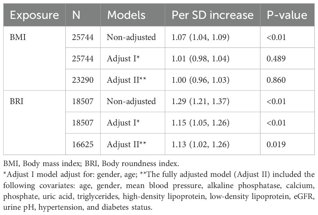 BMI and BRI were selected for further analysis. Variables with high variance inflation factors (VIF > 5), including TC/HDL ratio and TyG index, were excluded from the multivariate Cox proportional hazards models (Table 2). In the non-adjusted model, both BMI (hazard ratio (HR) 1.07, 95% confidence interval (CI) 1.04–1.09, p<0.01) and BRI (HR 1.29, 95% CI 1.21–1.37, p<0.01) showed significant positive associations with kidney stone risk. However, after adjusting for gender and age (Adjust I), the association for BMI became non-significant (HR 1.01, 95% CI 0.98–1.04, p=0.489), while BRI remained significant (HR 1.15, 95% CI 1.05–1.26, p<0.01). Only BRI showed a significant association (HR 1.13, 95% CI 1.02–1.26, p=0.019) when further adjusted for additional covariates (Adjust II).