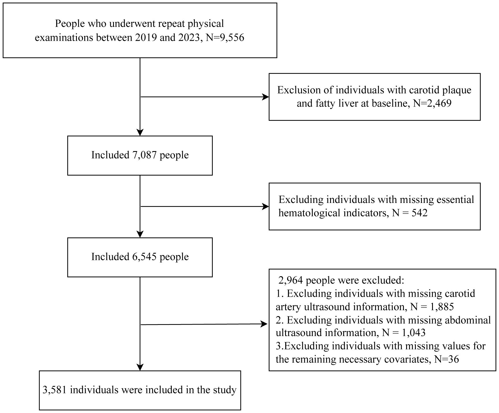 The study selected 9,556 individuals with serial physical examination data between 2019 and 2023. We excluded 2,469 individuals who had carotid plaque and fatty liver at baseline. After excluding 542 individuals with incomplete blood glucose or lipid data, 2,928 individuals lacking complete annual carotid and abdominal ultrasound records during the study period, and 36 individuals with incomplete covariate data, a total of 3,581 individuals were ultimately included in this study. The inclusion criteria are shown in Figure 1.