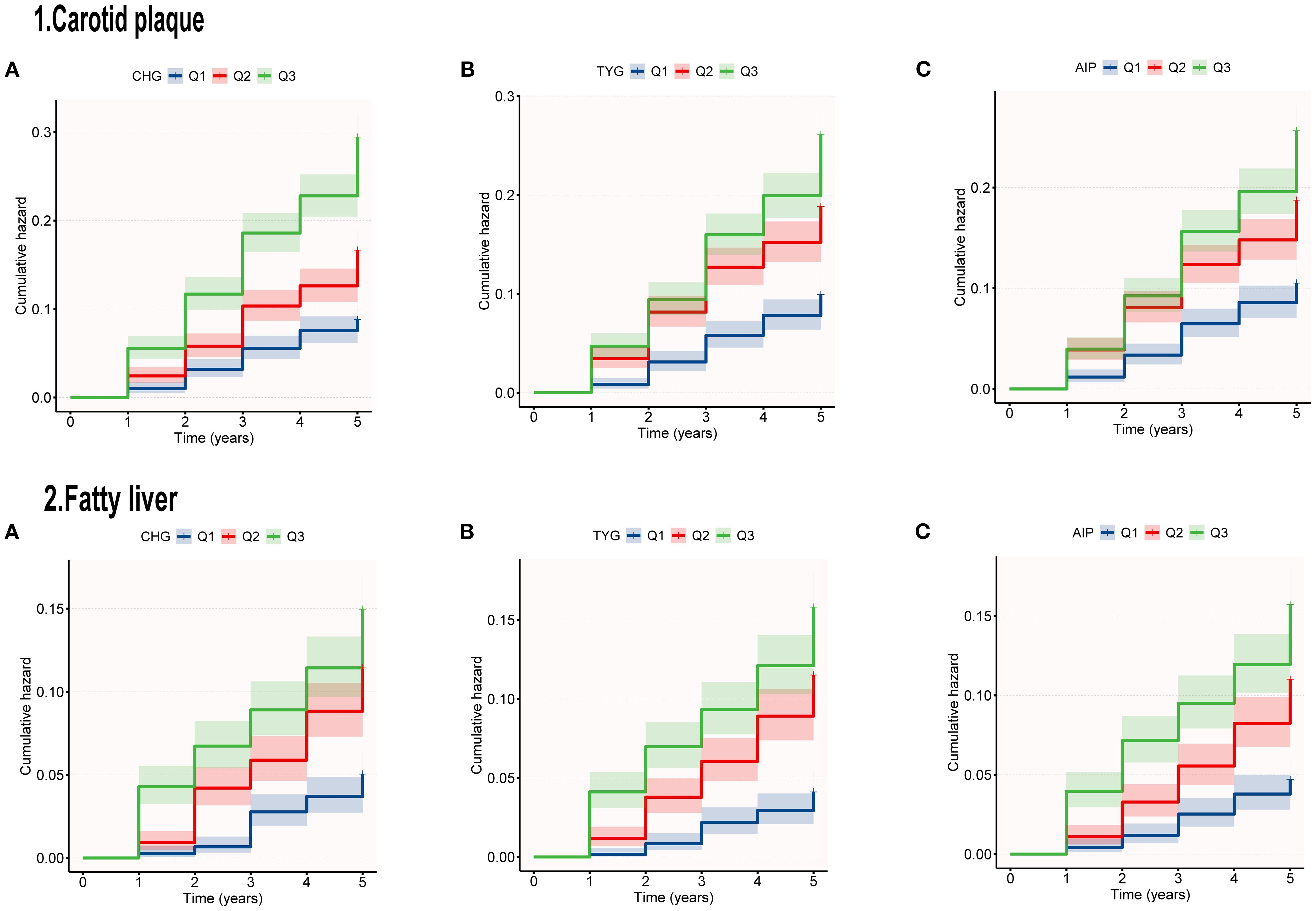 Categorical analysis revealed that compared with the Q1 group, the CHG-Q3 group exhibited significantly elevated risks for both outcomes (carotid plaque: adjusted HR = 1.85, P<0.001; fatty liver: HR = 2.53, P<0.001). TYG tertiles showed significant positive correlations with both outcome risks (P < 0.001). For carotid plaque, the adjusted risk ratio in the Q3 group compared to the Q1 group was 1.61. For fatty liver, the adjusted HR in the Q3 group compared to the Q1 group was 4.27. Results from the AIP study were consistent, with adjusted risk ratios for carotid plaque and fatty liver in the Q3 group (compared to Q1) being 1.95 (95% CI: 1.45–2.63, P < 0.001) and 3.47 (95% CI: 2.35–5.14, P < 0.001), respectively. Figure 2 shows that the risk of developing carotid artery plaques and fatty liver increases with higher tertiles of CHG, TYG, and AIP during the follow-up period.
