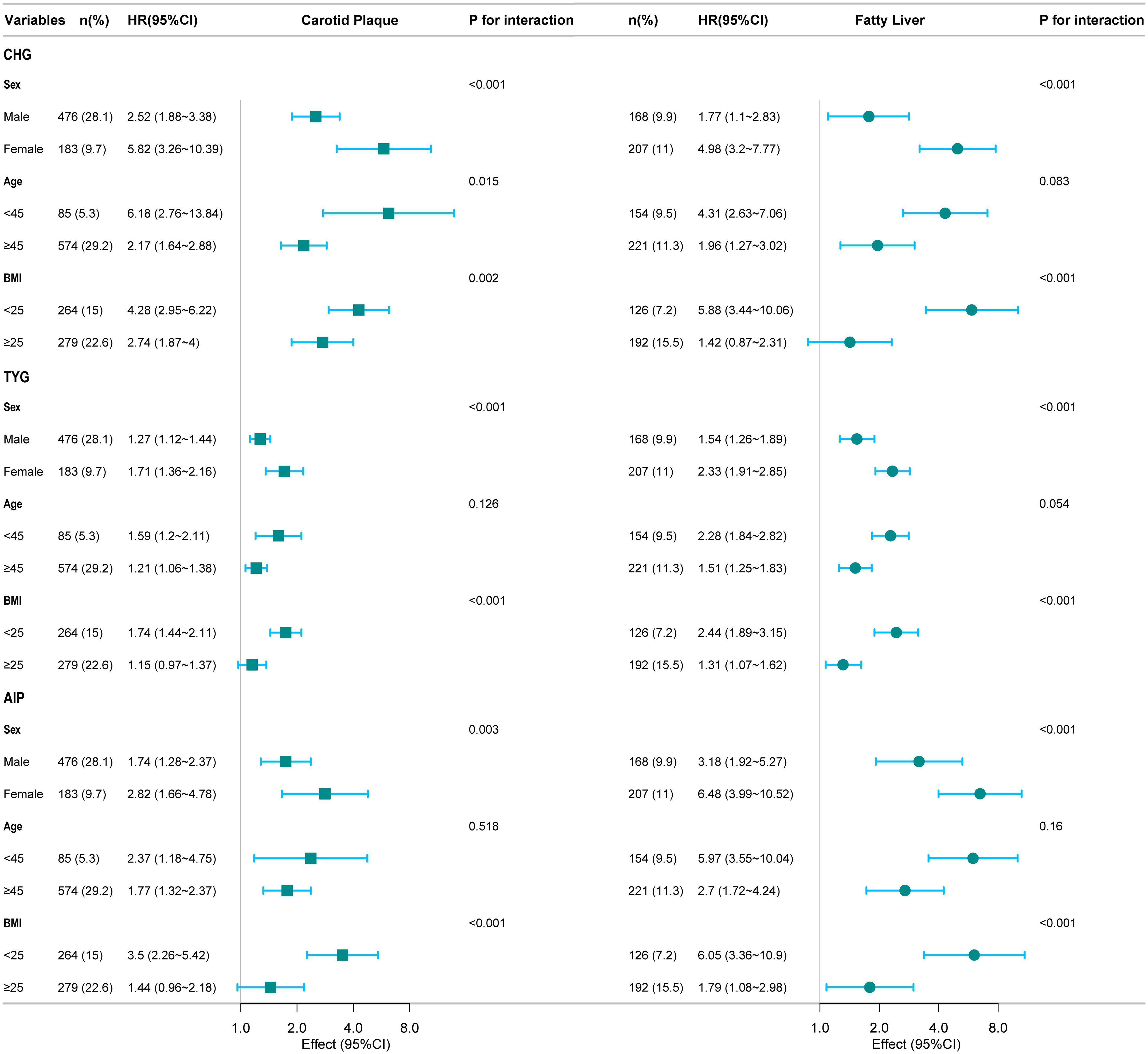 Subgroup analysis revealed that gender and BMI interacted with the relationship between the three indices with carotid plaque and fatty liver outcomes (Figure 5). In addition, age interacted with the relationship between CHG and carotid plaque outcomes.