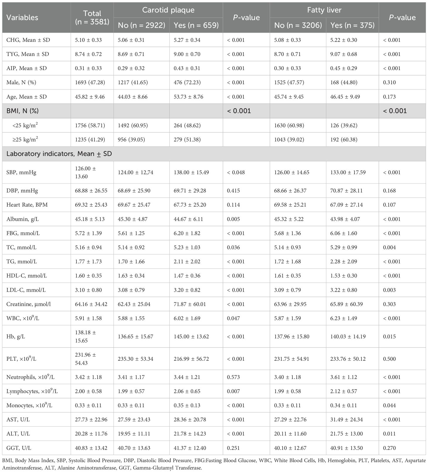 We used descriptive statistical methods to summarize the baseline characteristics of the study participants. The normality of continuous variables was assessed using the Shapiro-Wilk test and visual inspection of Q-Q plots. Continuous variables were normally distributed or approximately normally distributed, expressed as mean ± standard deviation. Categorical variables were expressed as N (%). Intergroup differences were analyzed using analysis of variance (ANOVA) for continuous variables and χ² tests for categorical variables. Multivariate Cox proportional hazards regression was performed to assess associations between CHG, TYG, and AIP levels and carotid plaque/fatty liver. Results are presented as hazard ratios (HR) with corresponding 95% confidence intervals (CI). Two models were adjusted. Model 1 adjusted for sex, age, and BMI. Model 2 additionally adjusted for diastolic blood pressure, systolic blood pressure, heart rate, creatinine, albumin, white blood cells, platelets, hemoglobin, neutrophils, lymphocytes, monocytes, gamma-glutamyl transpeptidase, alanine transaminase, and aspartate transaminase. All variables passed multicollinearity tests, with variance inflation factor values below 5 (Supplementary Table S1). Using the Cox regression model, we established restricted cubic splines (RCS) and assessed dose-response relationships using the likelihood ratio test.