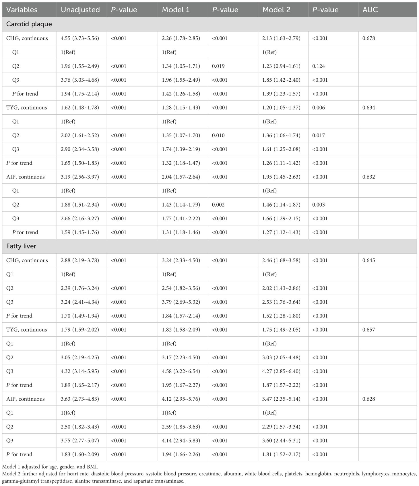Conclusions: Our research found that CHG, TYG, and AIP were positively correlated with carotid plaque and fatty liver. Moreover, CHG demonstrated superior predictive ability for carotid plaque outcomes, whereas TYG demonstrated better performance for fatty liver outcomes.