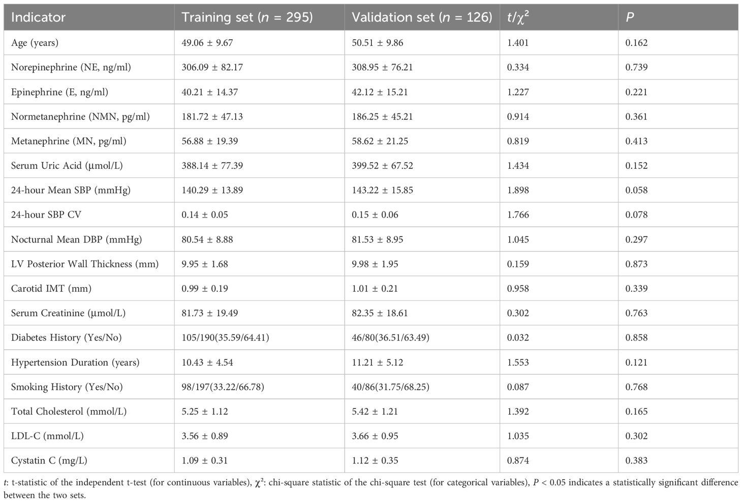 No significant differences (P > 0.05) were observed in age, catecholamines (NE, E, NMN, MN), SUA, BP parameters, target organ indices, or comorbidities (diabetes, smoking history) between training and validation sets, confirming comparability (Table 1).